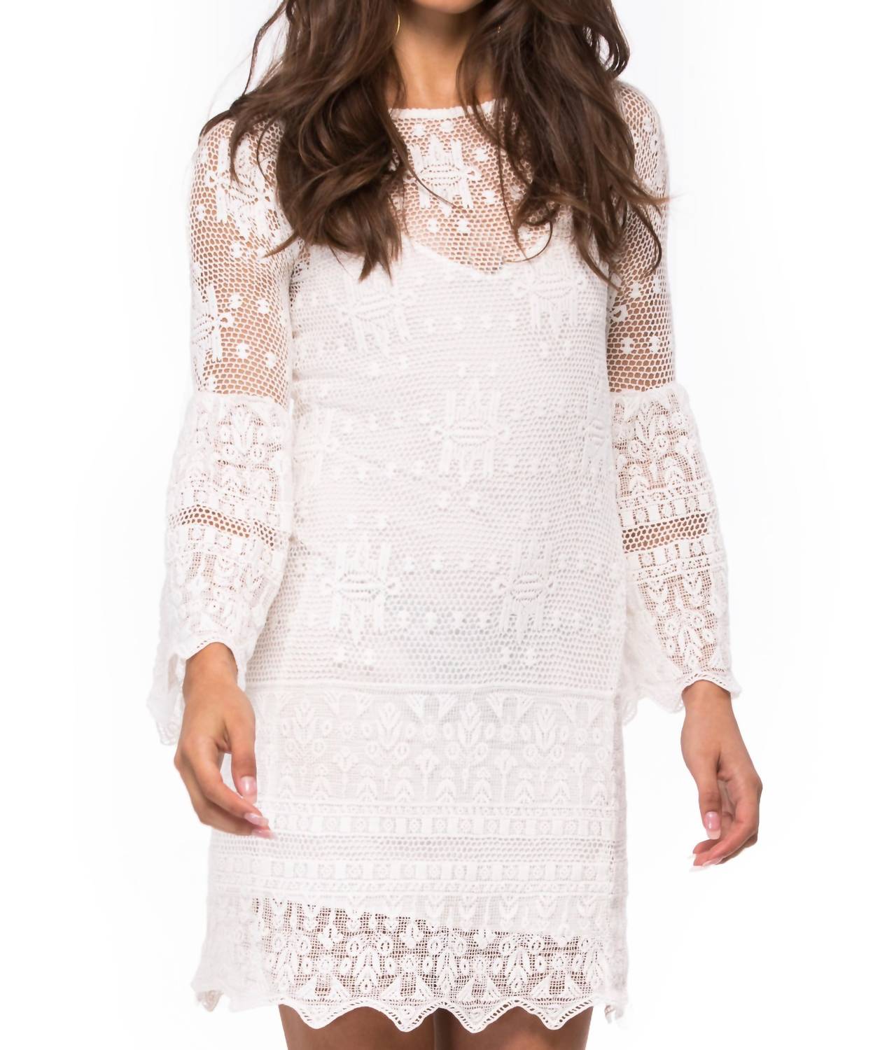 A short and breezy dress for those warmer days. Embrace timeless elegance with the Evoke Aztec Lace Mini Dress by Jen's Pirate Booty in Sierra Madre White, perfect for an anniversary or Christmas celebration. This boho chic mini dress features longs sleeves and a shift silhouette that drapes beautifully with its boatneck design. Crafted from 100% cotton lace with a slip lining of 48% rayon and 52% viscose, it embodies effortless style and comfort. Closure: Pull on. Care: Hand wash, line dry.