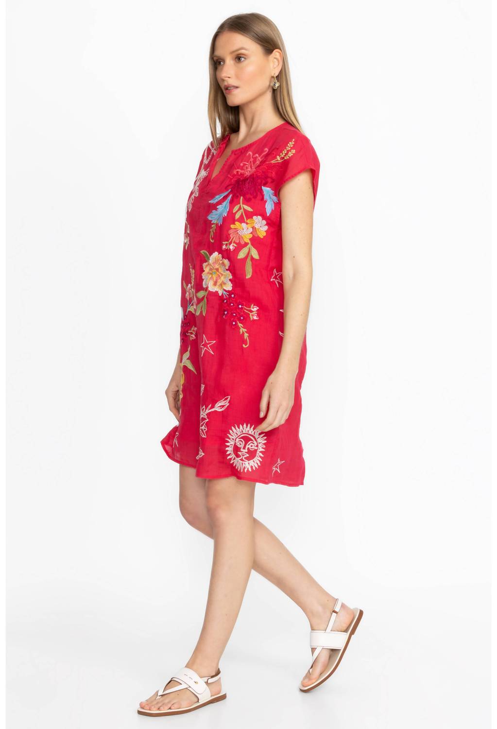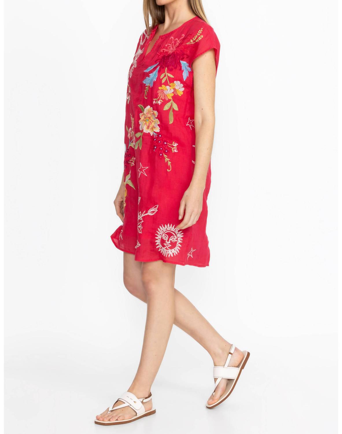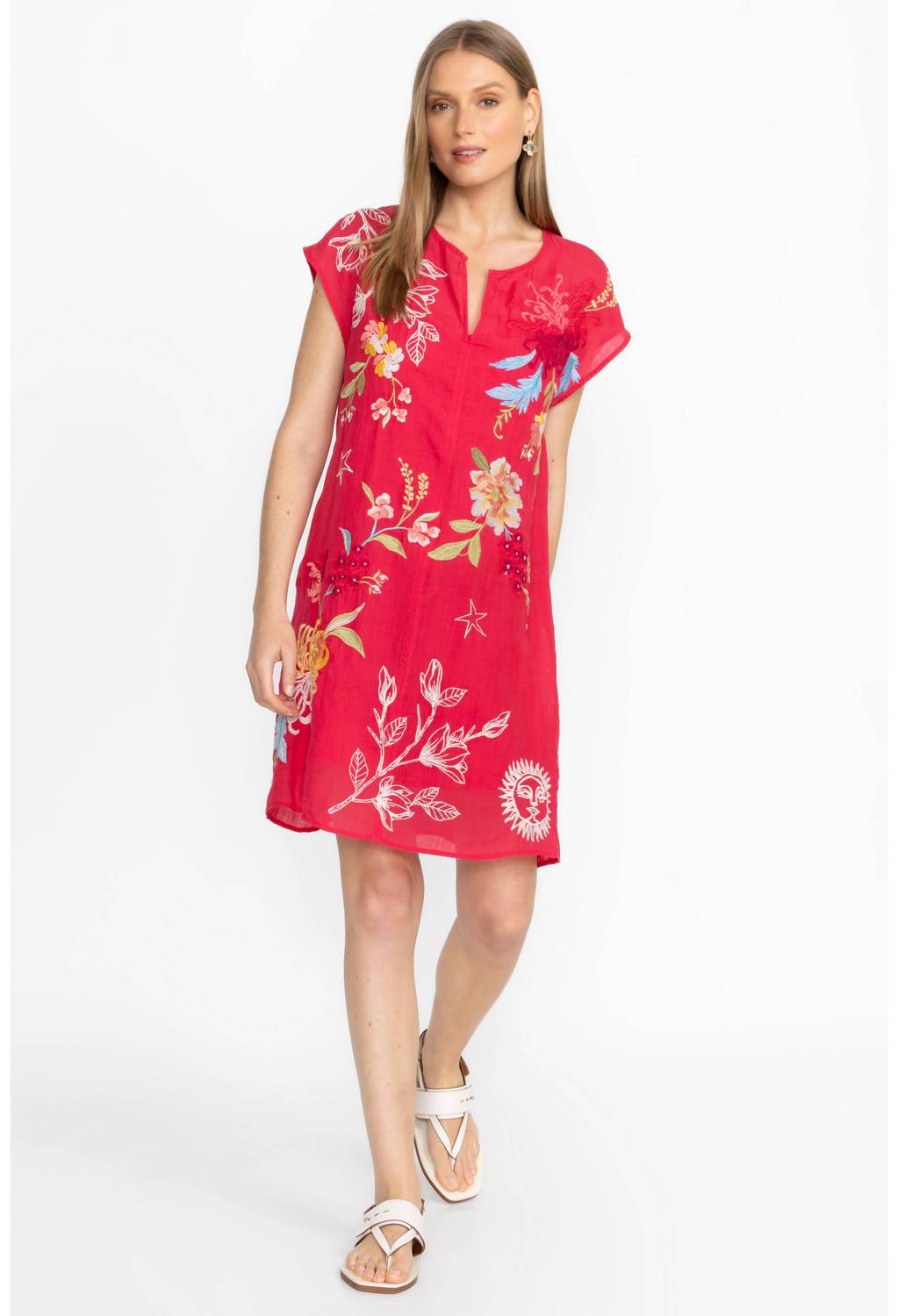 A short and breezy dress for those warmer days. Step into summer with the Playa Dress by Johnny Was, a vibrant boho chic staple in stunning Malory Pink. This mini dress features relaxed Dolman short sleeves, a floral pattern, and a split V-neck, encapsulating effortless style. It measures 36.5 inches in length and comes with a slip for extra coverage. Care is straightforward with machine wash and tumble dry instructions, allowing easy maintenance.