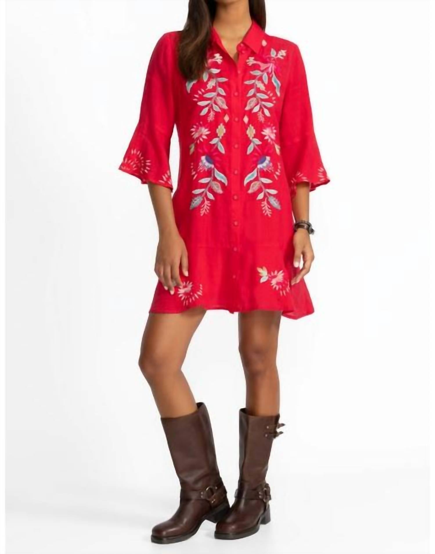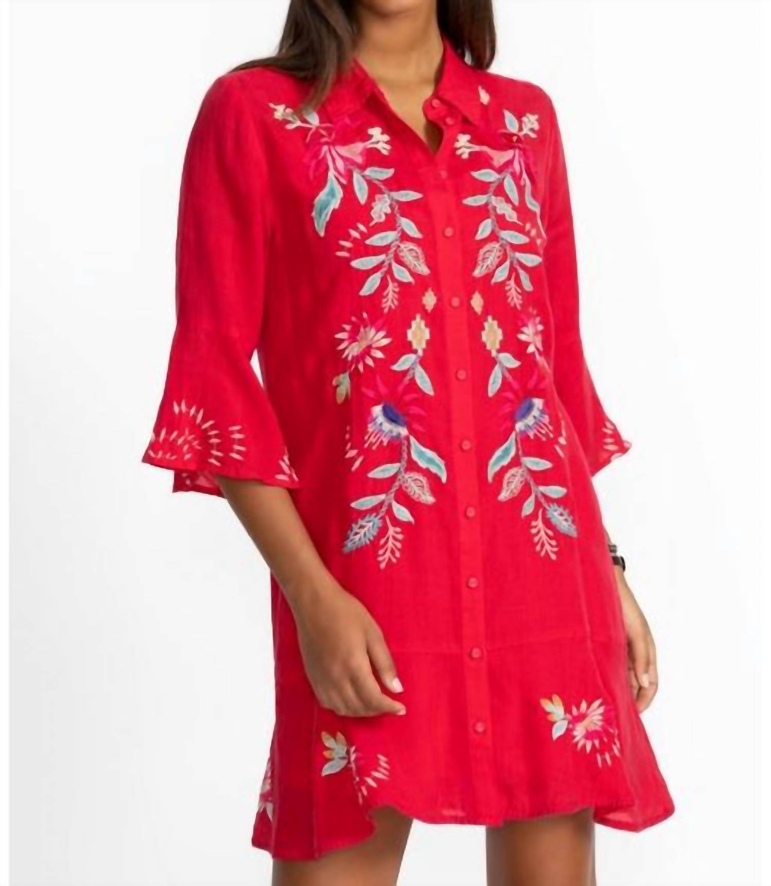 The Tiered Flounce Dress is beautifully embroidered with colorful floral designs, expertly blending bold colors with casual comfort. Made from lightweight, flowing fabric, this dress includes a slip lining and features a button-front closure. It features flounce sleeves and a flounce hemline, adding texture to the design.