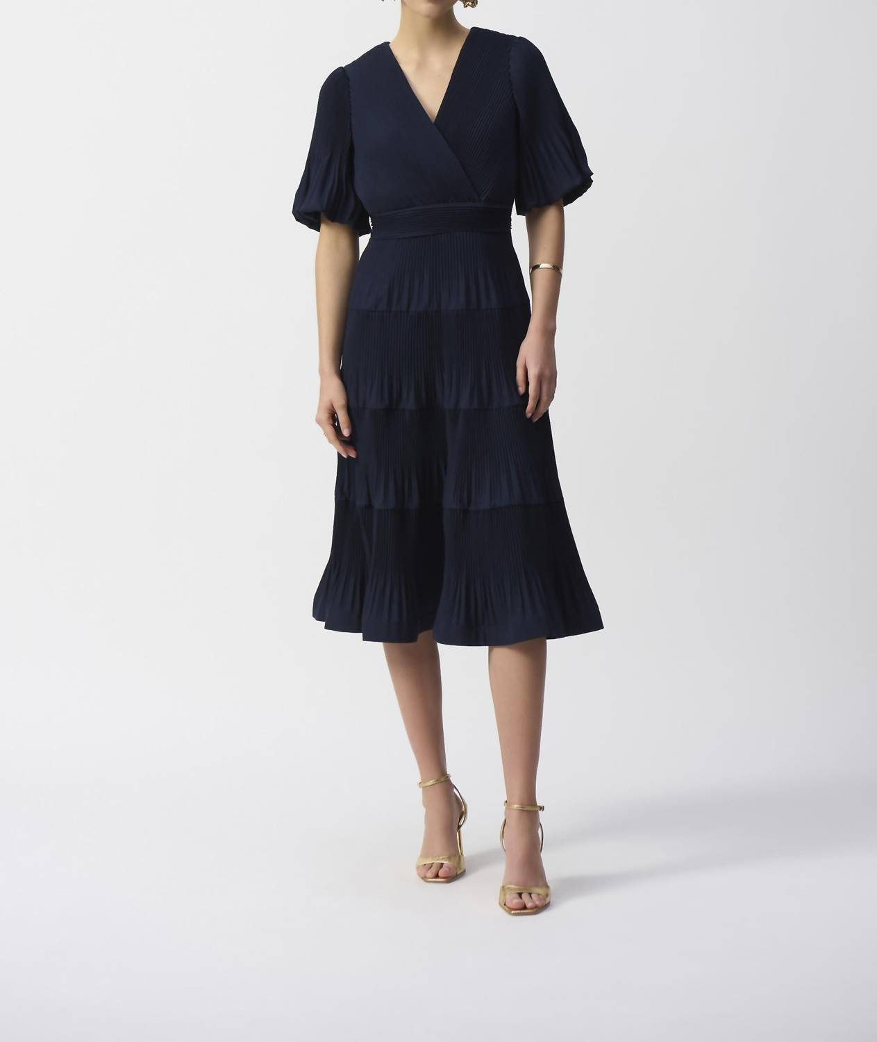 A midi dress so versatile, your options for wearing it are endless. Discover the Pleated Woven Fit And Flare Dress by Joseph Ribkoff, a sophisticated choice in elegant Midnight Blue. This midi dress features a flattering V-neck and charming puff short sleeves, making it a perfect fit for any occasion. Crafted from 100% Polyester, it offers comfort and chic style with its lined design. Closure: Back zipper. Care: Dry clean only. Approximate length for size 12 is 46 inches (117 cm).