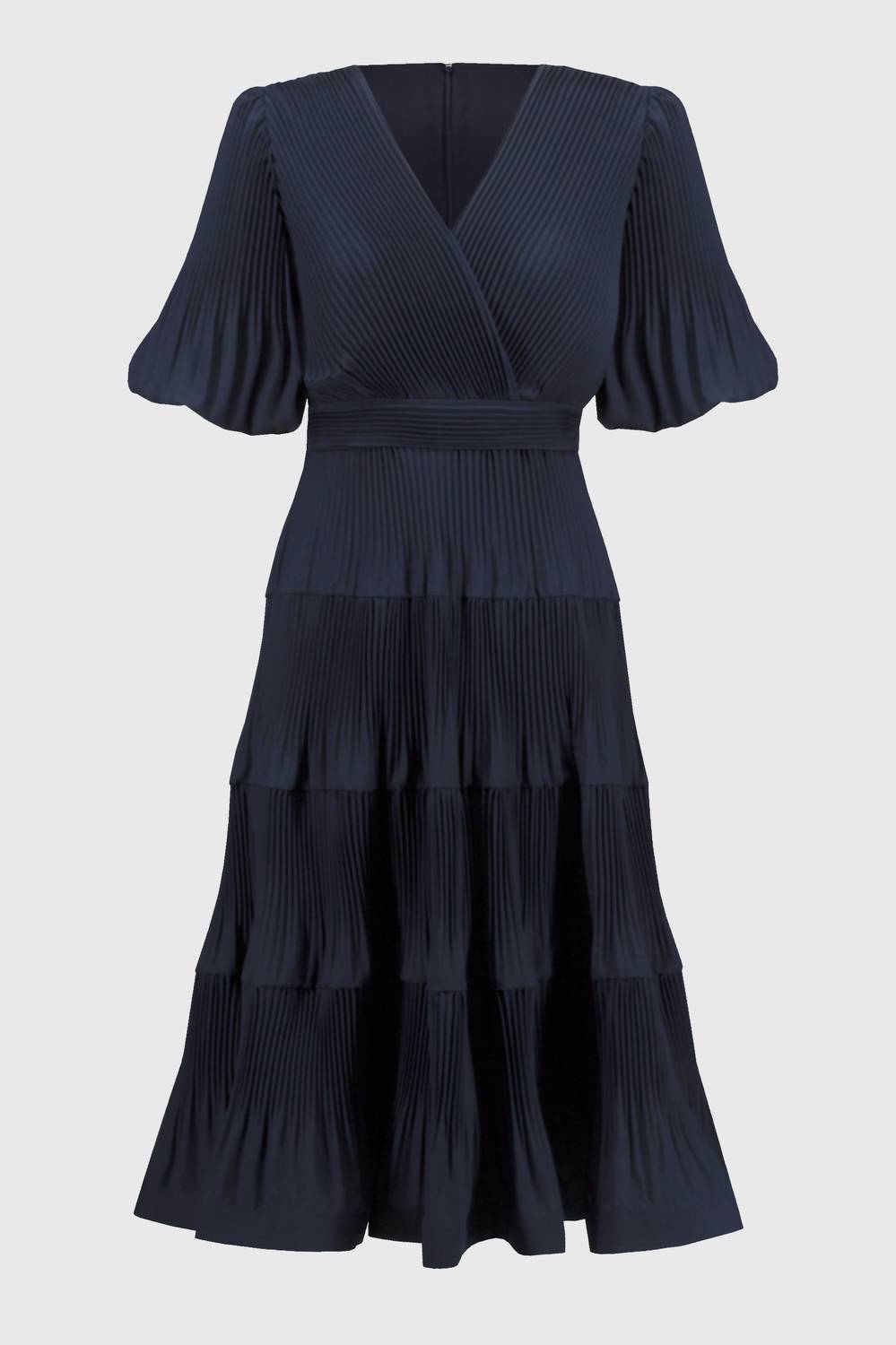Discover the Pleated Woven Fit And Flare Dress by Joseph Ribkoff, a sophisticated choice in elegant Midnight Blue. This midi dress features a flattering V-neck and charming puff short sleeves, making it a perfect fit for any occasion. Crafted from 100% Polyester, it offers comfort and chic style with its lined design. Closure: Back zipper. Care: Dry clean only. Approximate length for size 12 is 46 inches (117 cm).