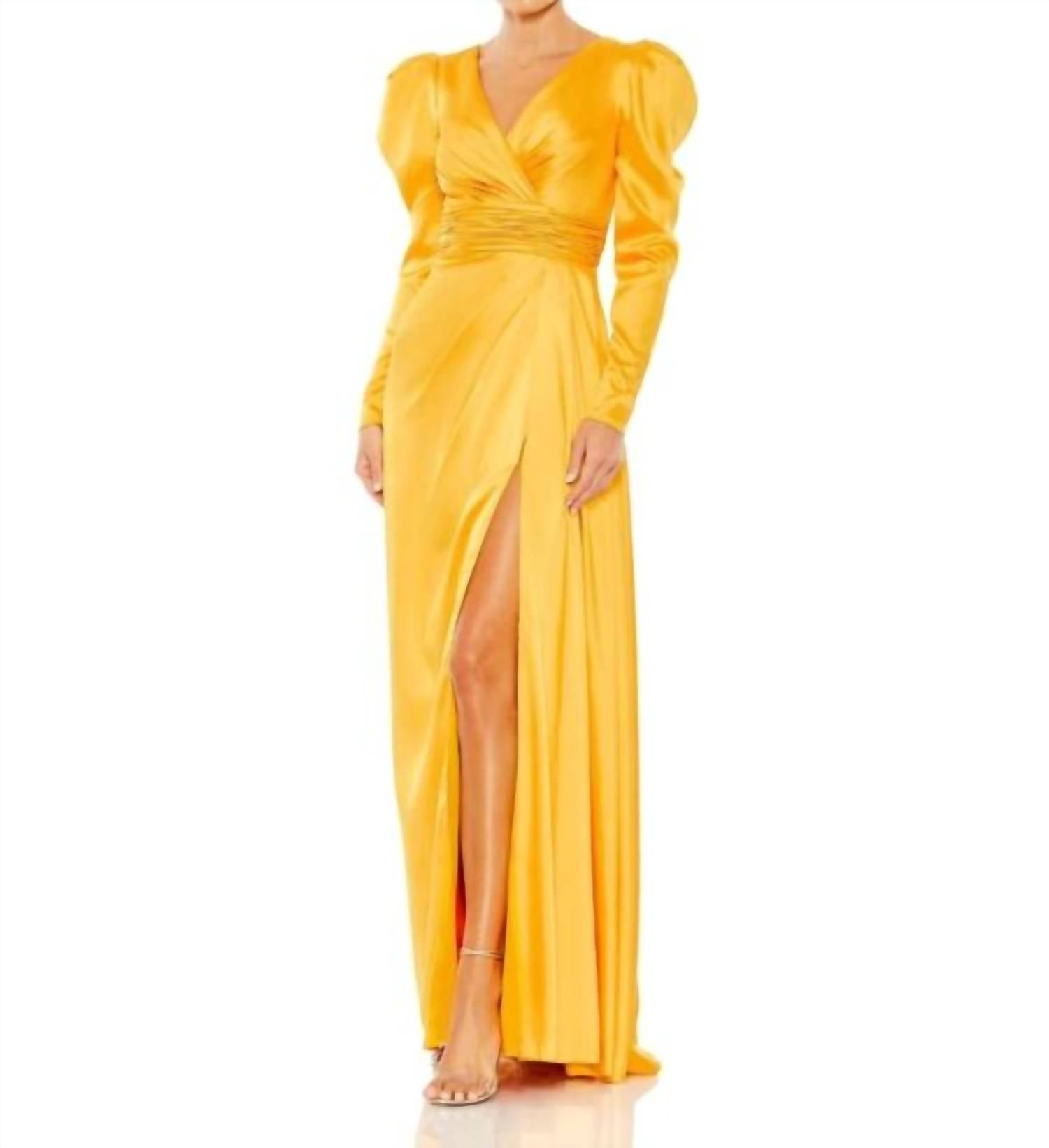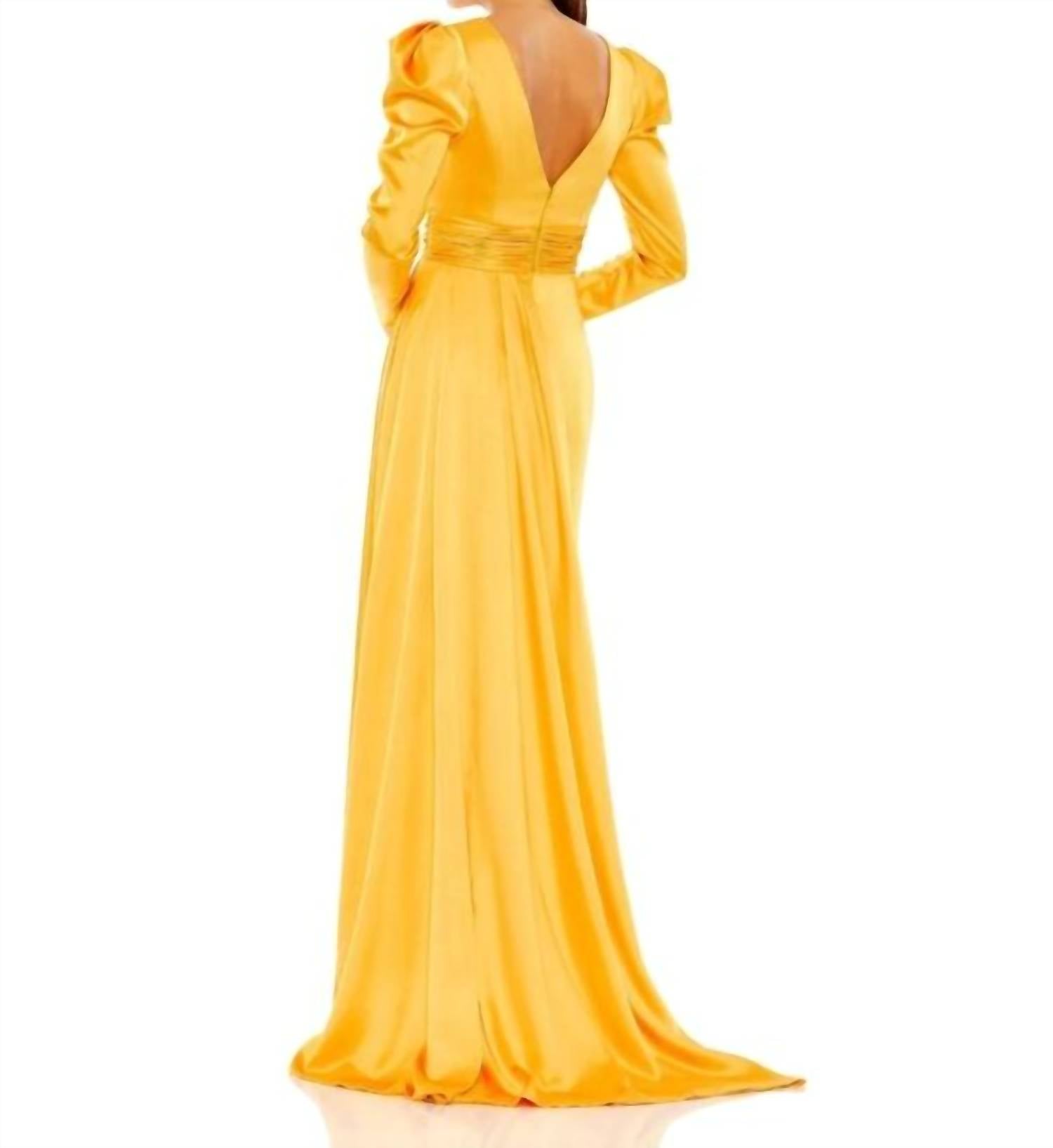 The MAC DUGGAL V Neckline Long Puff Sleeves Maxi Column Gown is a luxurious choice for evening events, designed in a captivating mango hue. Crafted with long sleeves and a V-neck, this gown features a ruched surplice bodice and pleated A-line silhouette. The dress showcases a low V-back, thigh-high slit, and sweep train, complete with a side overlay for a dramatic effect. Closure: Zip closure. Elevate your spring wardrobe with this statement piece, embodying the quiet luxury trend.