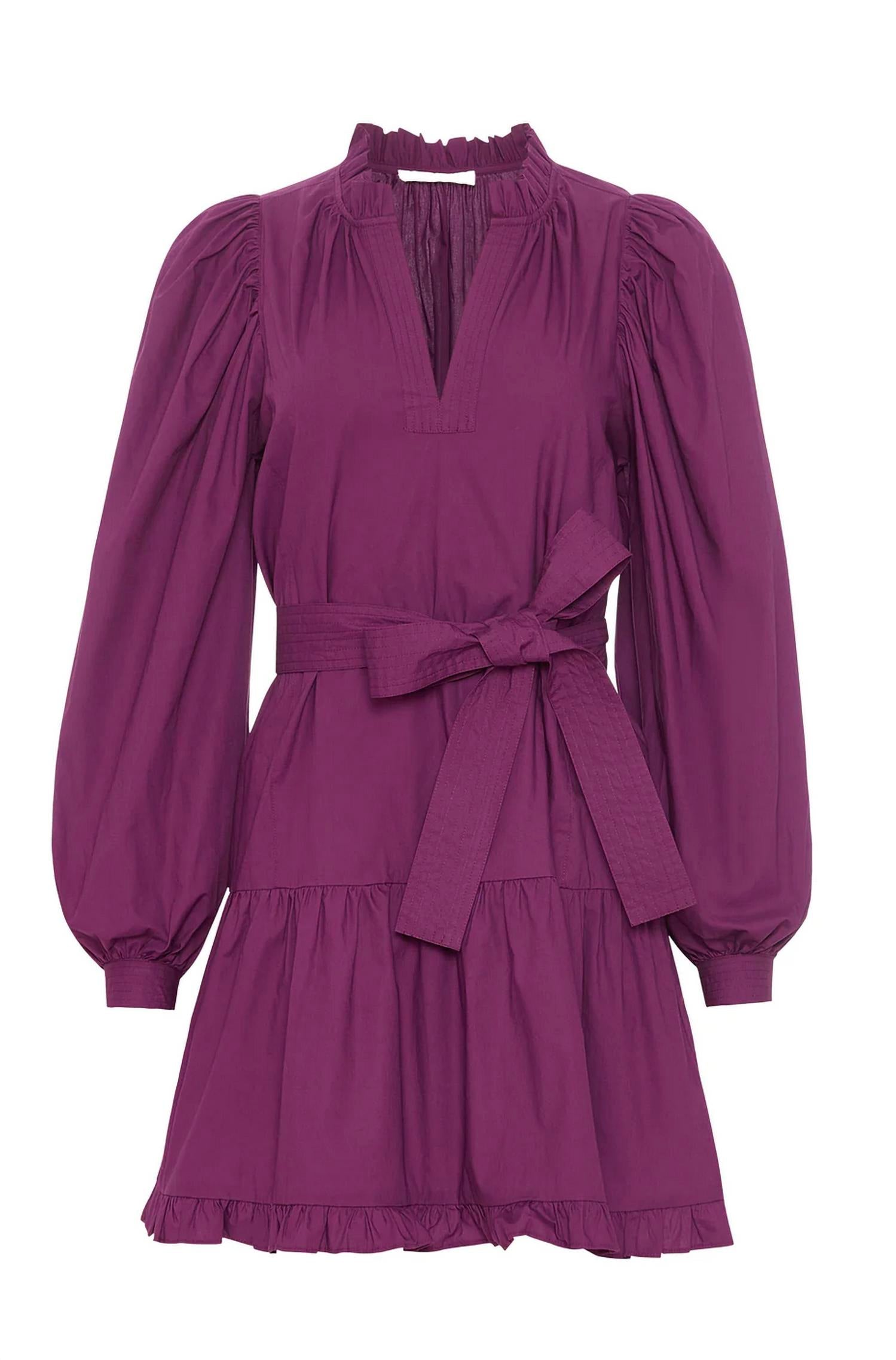 A short and breezy dress for those warmer days.The Nella dress features romantic details like puffed sleeves, tailored cuffs, delicate pleating, and ruffles along the hem and neckline. With a drop waist, full skirt, and optional tie belt, this deep Plum Purple dress is perfect for fall. Made from 100% cotton, unlined, and true to size.