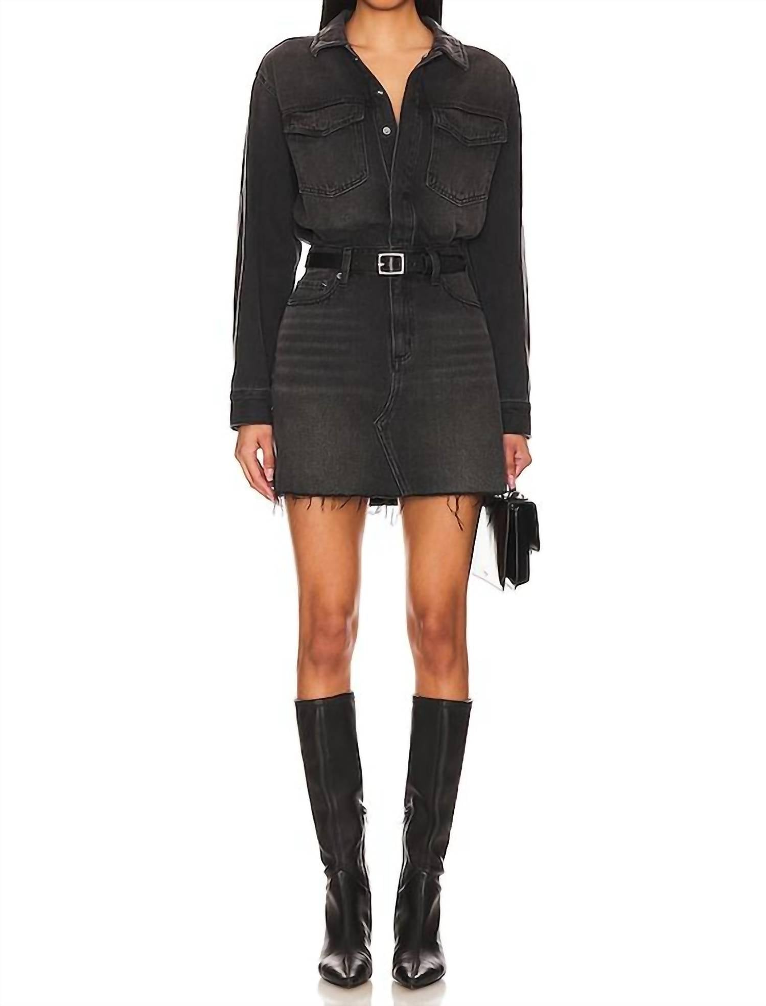 The perfect mini dress for those warmer months. This dress features a long sleeve button-up top that transitions into a raw hem mini skirt, crafted from non-stretch denim. It includes functional pockets and belt loops for added style. Made from 100% cotton, it has an approximate length of 33.07 inches. Machine washable and imported.