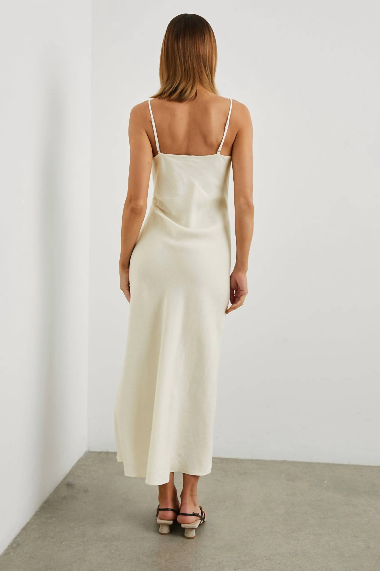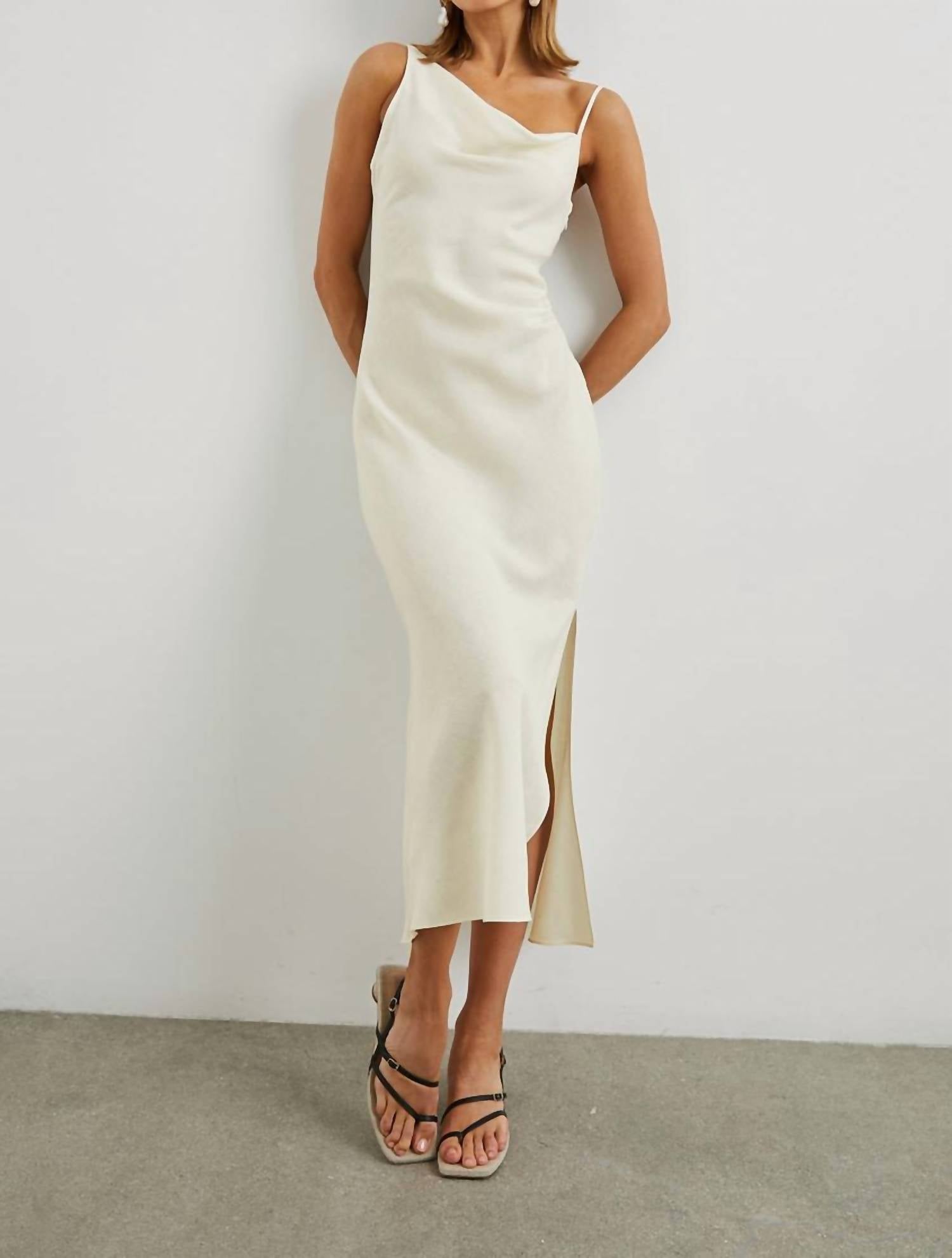 A midi dress so versatile, your options for wearing it are endless. Featuring delicate spaghetti straps and a chic asymmetrical cowl neck with an adjustable strap, this dress is crafted from a luxe blend of 70% Viscose and 30% Linen. Garnering sophistication with its 45.25" midi length, this piece is imported and secures with a side zipper. Dry clean only.