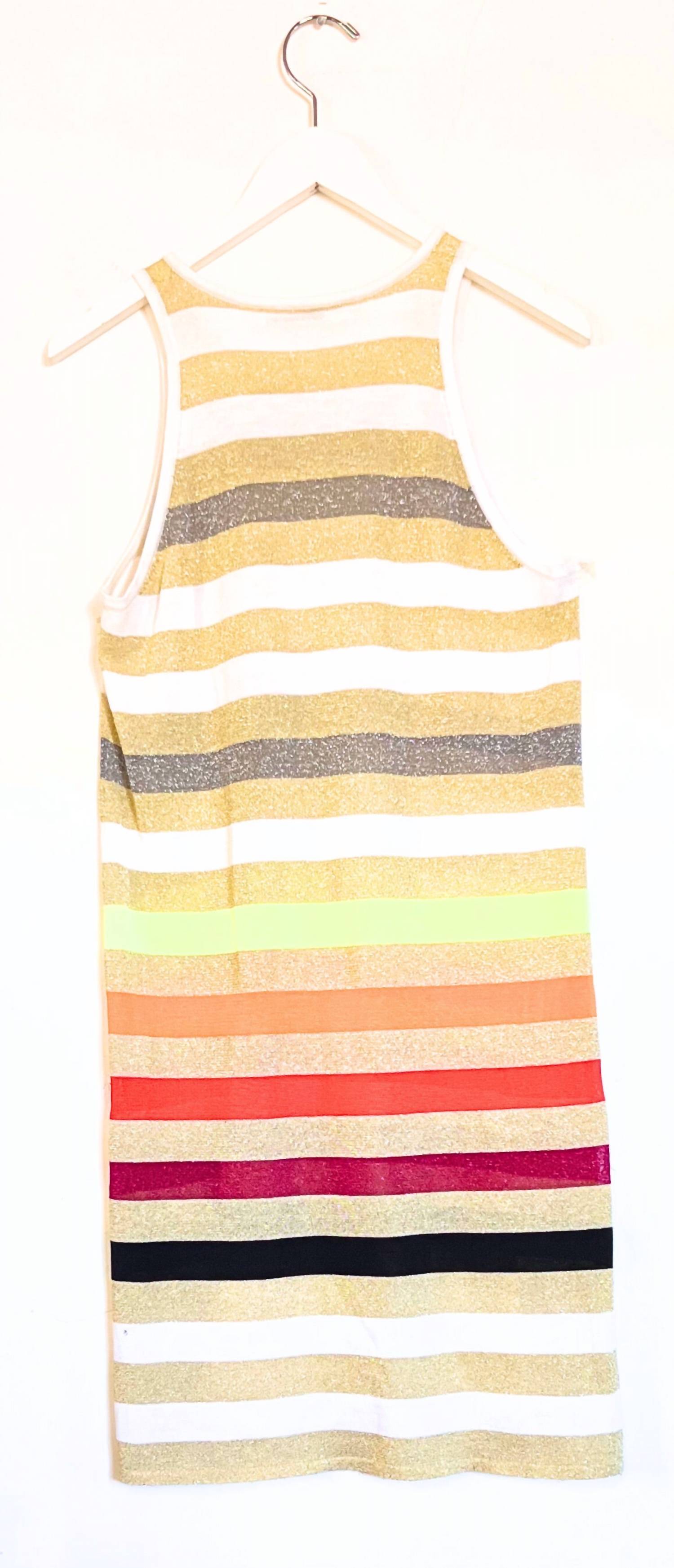 The kind of easy and flattering dress you'll be reaching for all season long. Elevate your travel wardrobe with the Sunset Stripe Tank Dress by Replica Los Angeles, a slim-fit sheath in a dazzling gold/multi stripe perfect for spring occasions. Sleeveless and designed with a crewneck, this mini dress is crafted from a 50% Cotton 50% Modal blend with Lurex for added sparkle. Closure: Pull-on style for easy wear. Care: Hand wash cold or dry clean. Model is 5'7" and is wearing a size S.