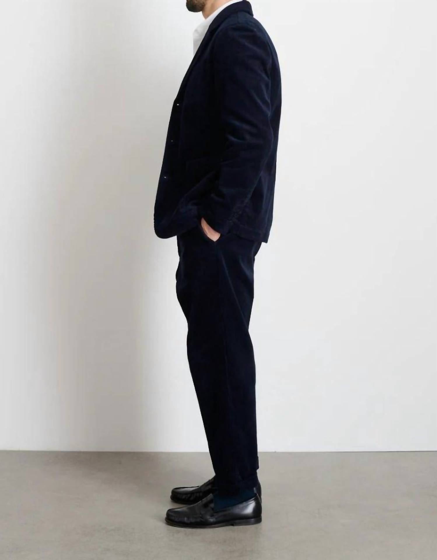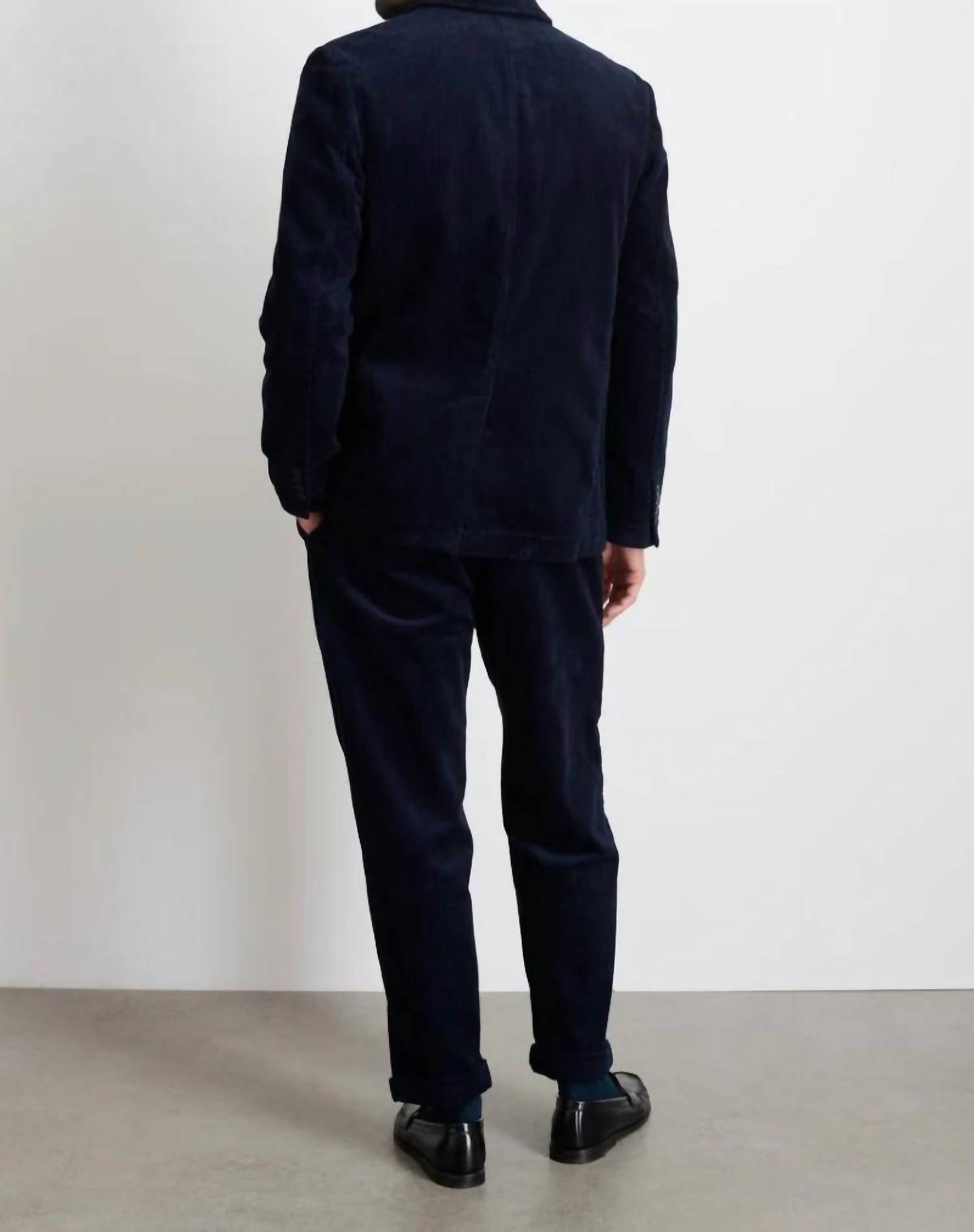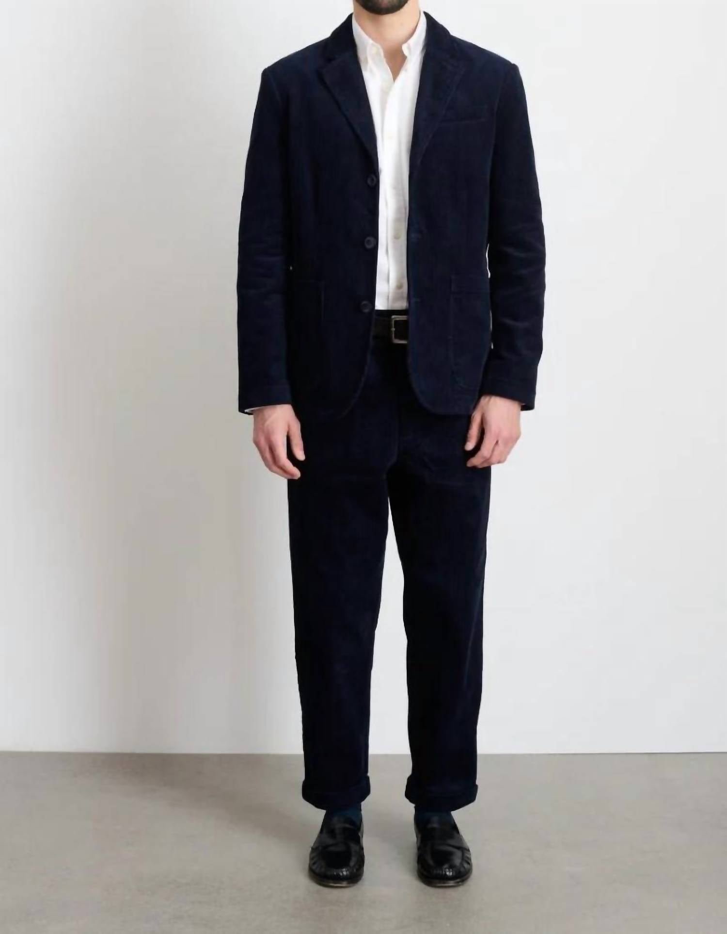 Elevate your look with the Mill Blazer in Corduroy by ALEX MILL, a perfect blend of sophistication and comfort. This black blazer features long sleeves and a timeless collar, crafted from 100% cotton for a rugged yet casual feel. Its button closure and textured pattern add classic details, while its lined interior ensures a polished finish. Measuring 30.25" in length, this piece offers a fit true to size, with a chest measurement of 43.25" for a size medium.
