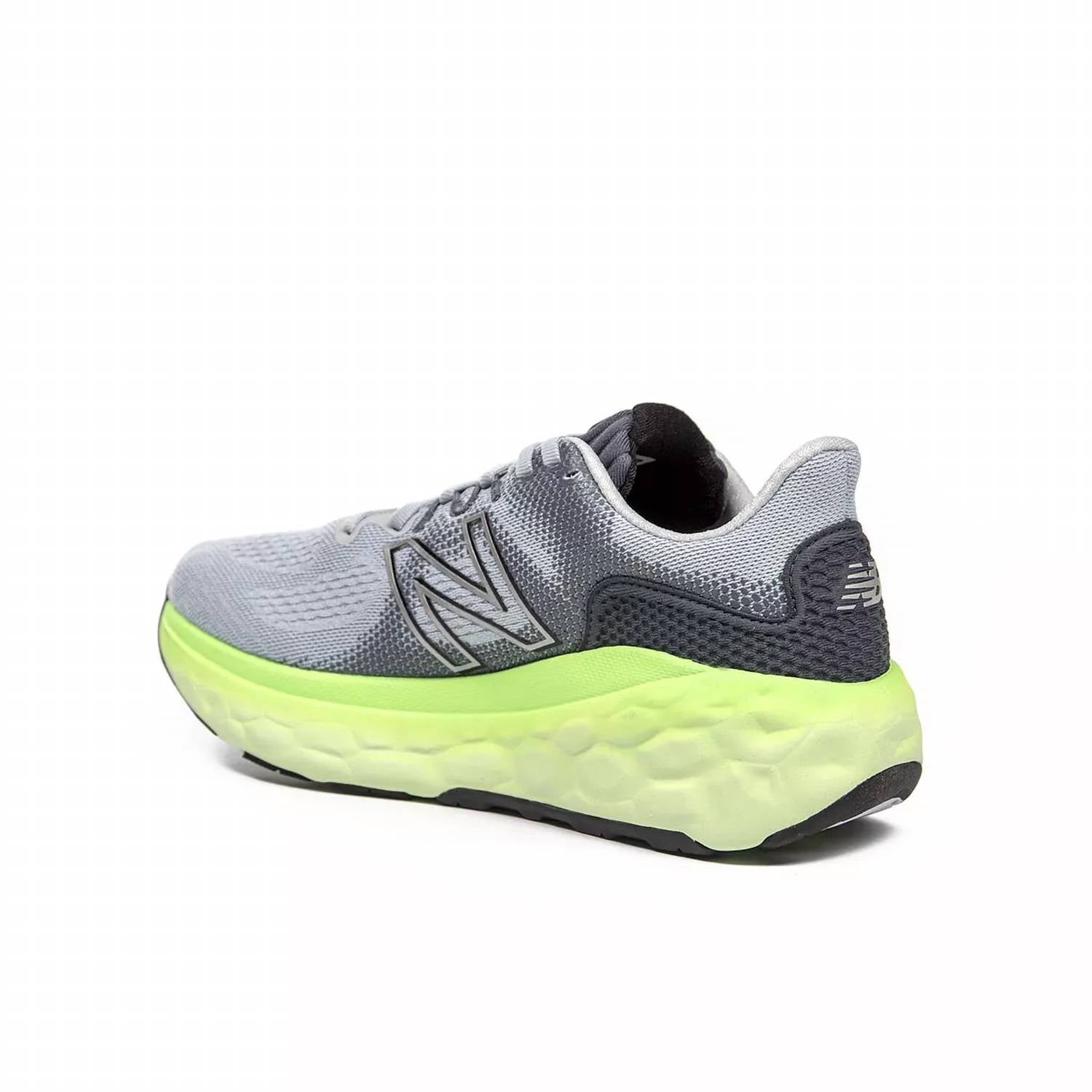 Introducing the Men's Fresh Foam X More V3 Running Shoes by New Balance, showcasing a lightweight design in Light Slate and Vibrant Spring. These neutral athletic shoes feature a plush Fresh Foam midsole, enhancing comfort for long runs or workdays. The shoe is crafted with a soft engineered mesh upper for optimal breathability and incorporates a unique outsole design for improved traction. Ideal for everyday training on the road, it weighs 10.9 oz (M) with a 4mm drop, featuring a round toe and medium width, perfect for those embracing the athleisure trend.