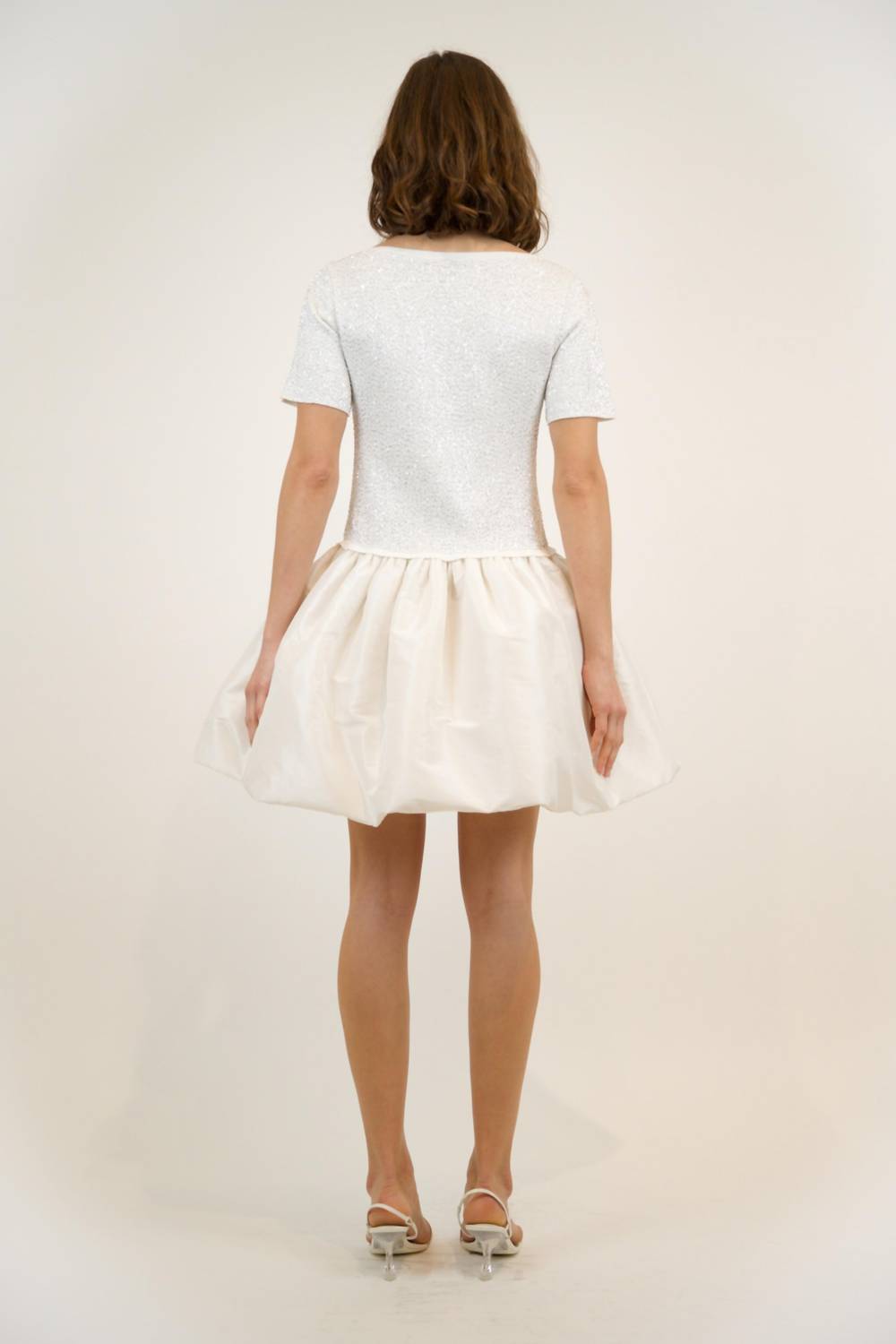 The kind of easy and flattering dress you'll be reaching for all season long. Meet the Kenz Knit Ruffle Mini Dress by SIMKHAI, a stunning cocktail party essential in classic ivory. Featuring short sleeves and a playful structured silhouette, this dress captures the 90s fashion trend beautifully with its A-line design and ruffled skirt. Crafted in a blend of 70% Polyester 30% Nylon, it offers a luxurious feel ideal for summer soirées. Closure: Convenient pull-on style. Care: Dry clean only. Imported. The model is 5'10" and is wearing a size small.