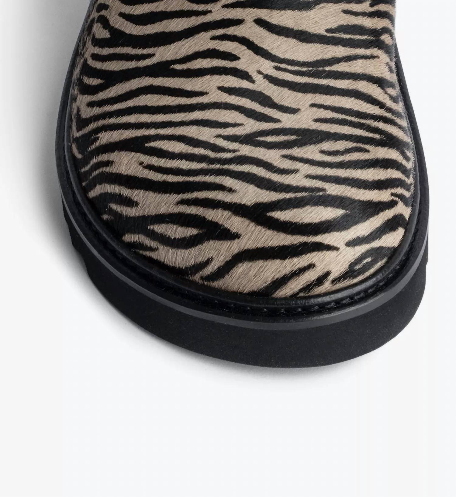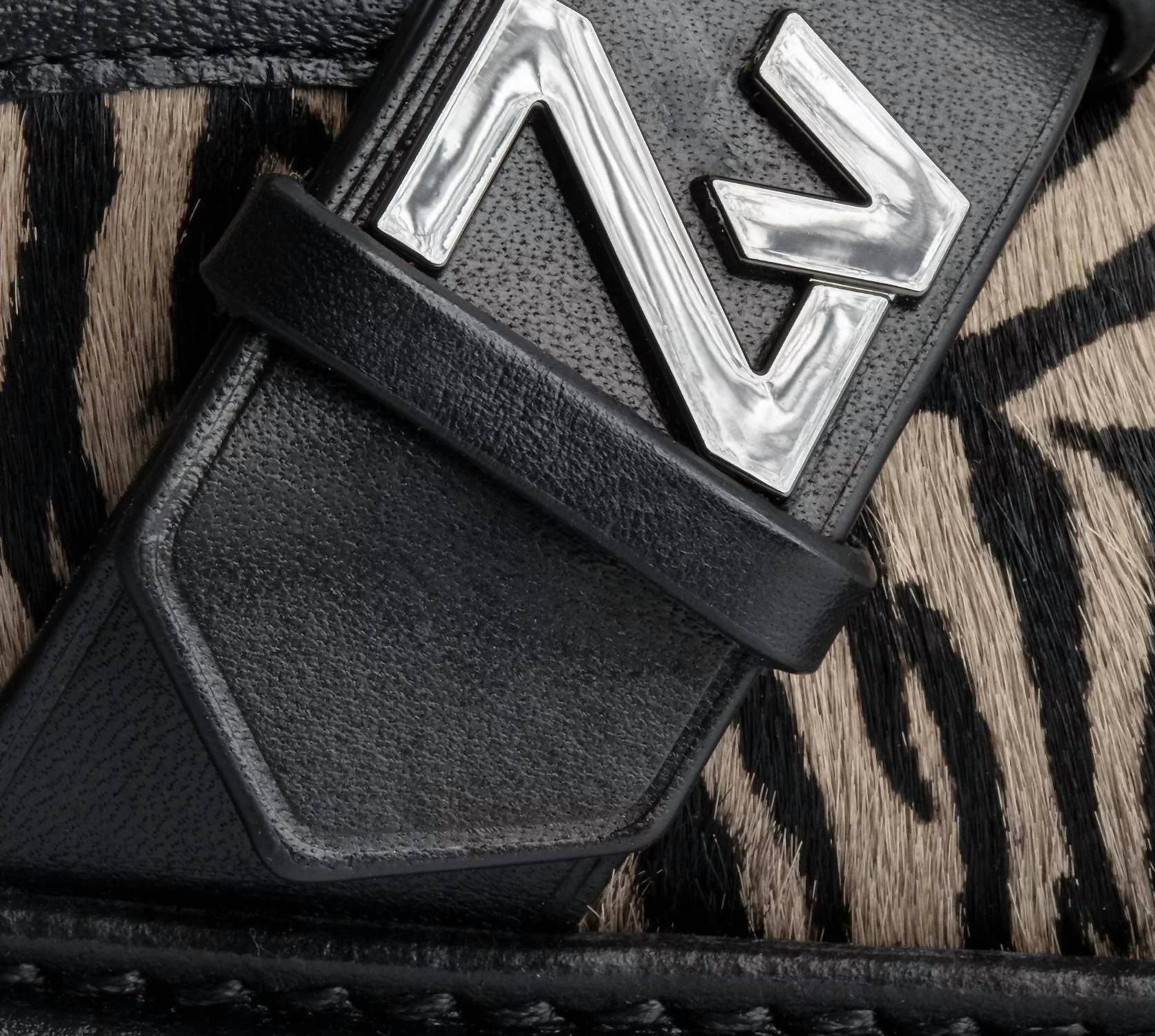 Slips on. Round toe. Flat sole. Zebra print throughout. Silver-tone logo detail at the side. Upper: 100% Leather. Lining: 100% Leather. Sole: 100% Rubber. Specialist leather clean. Heel height 3cm. Made in Portugal.