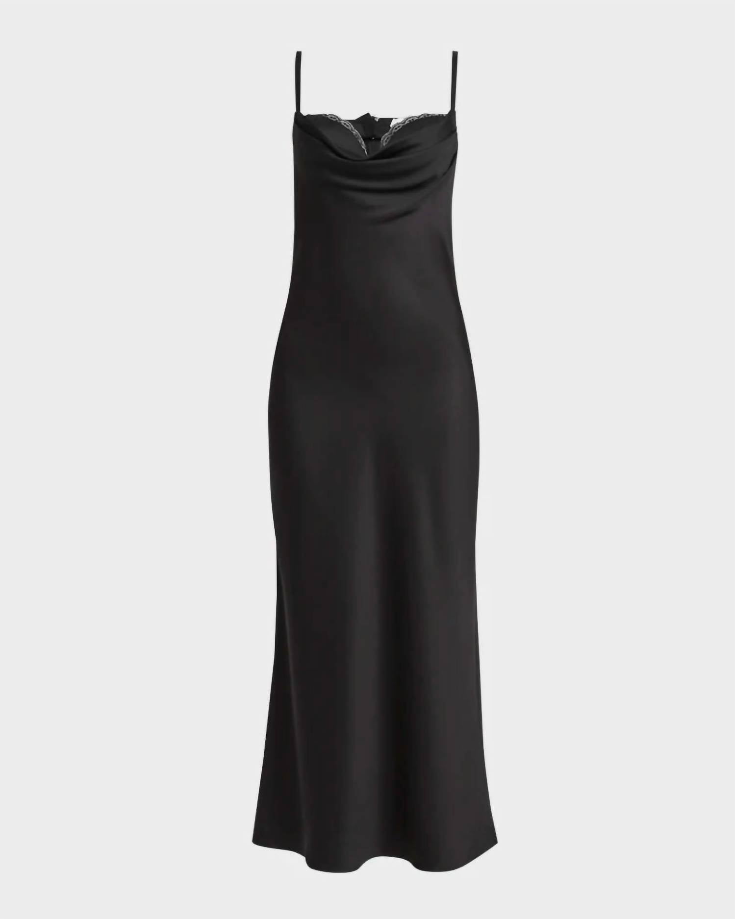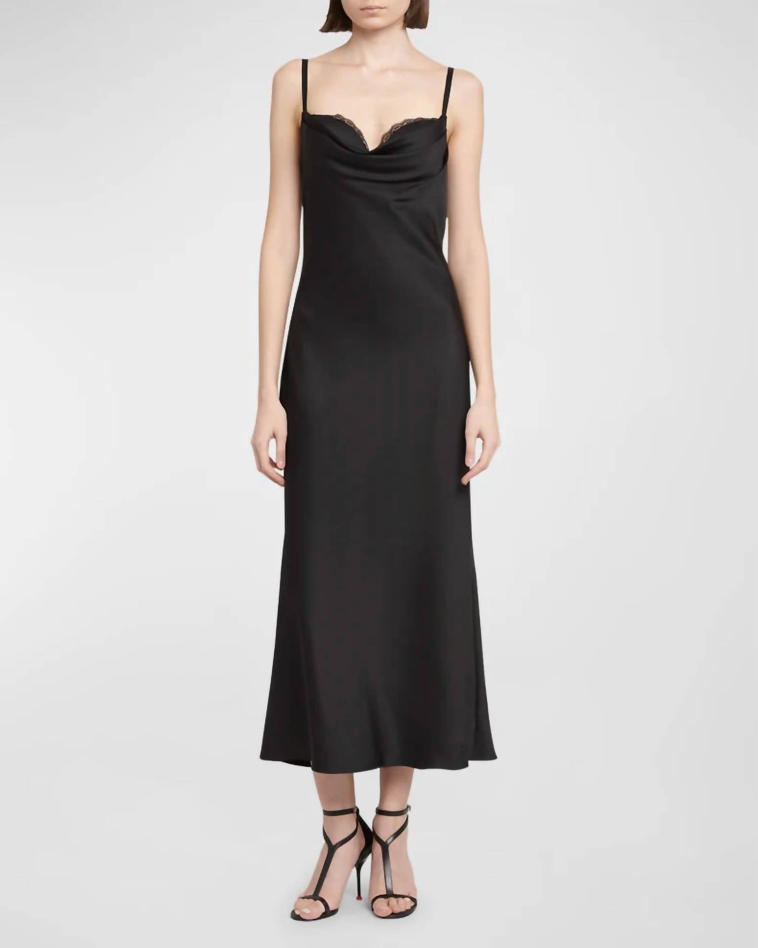 Just add slides or mules and you are good to go. Elevate your wardrobe with the Draped Bustier Midi Dress by Alexander McQueen in timeless black. This elegant spaghetti strap dress features adjustable straps, a cowl neck with lace trim, and a sweetheart neckline, offering a sophisticated touch. Crafted from 100% silk with polyamide trim, the dress showcases an A-line silhouette, with the hem gracefully falling below the knee for an exquisite finish. Closure: Invisible back zipper. Drying method: Line dry.