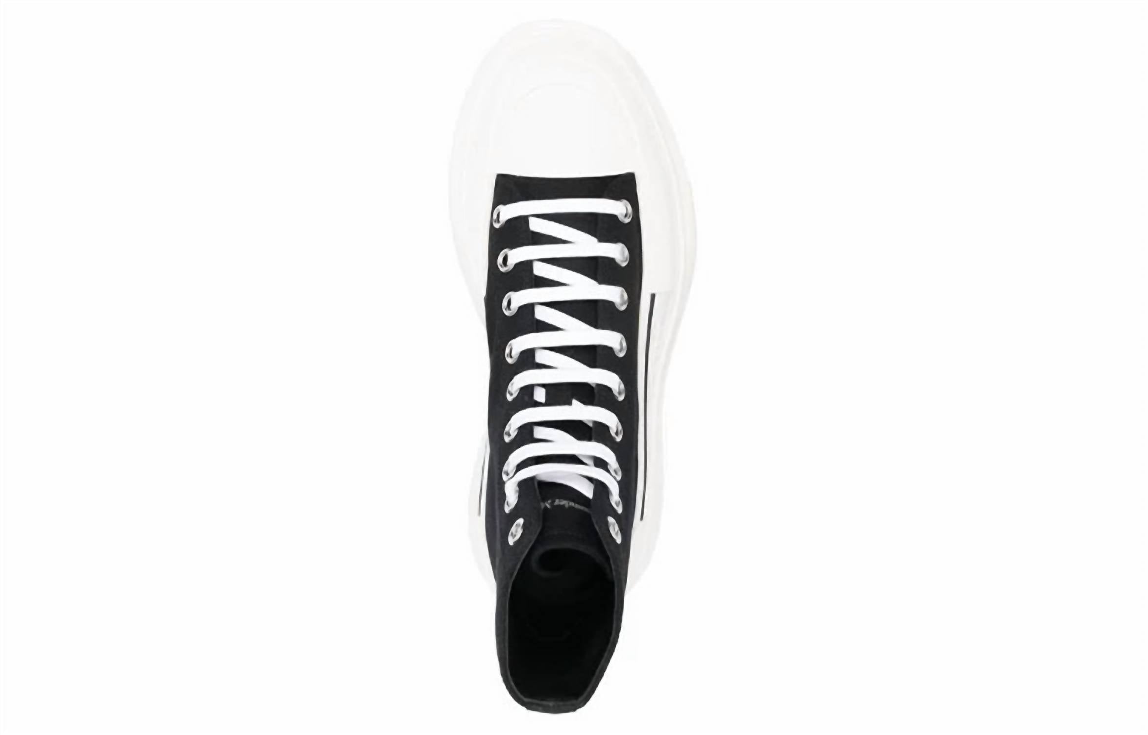 Introducing the Men's Tread Slick High Top Sneakers by Alexander McQueen, an edgy addition to your footwear collection. Crafted from durable cotton, these black and white lace-up sneakers boast a round toe shape, accentuated with a textured rubber wrap and rubber toe cap for contemporary style. The standout feature is the thick oversized rubber tread sole, ensuring both comfort and statement-making strides, while a signature ribbon adorns the back. Made in Italy, these sneakers are designed for those who appreciate avant-garde design.
