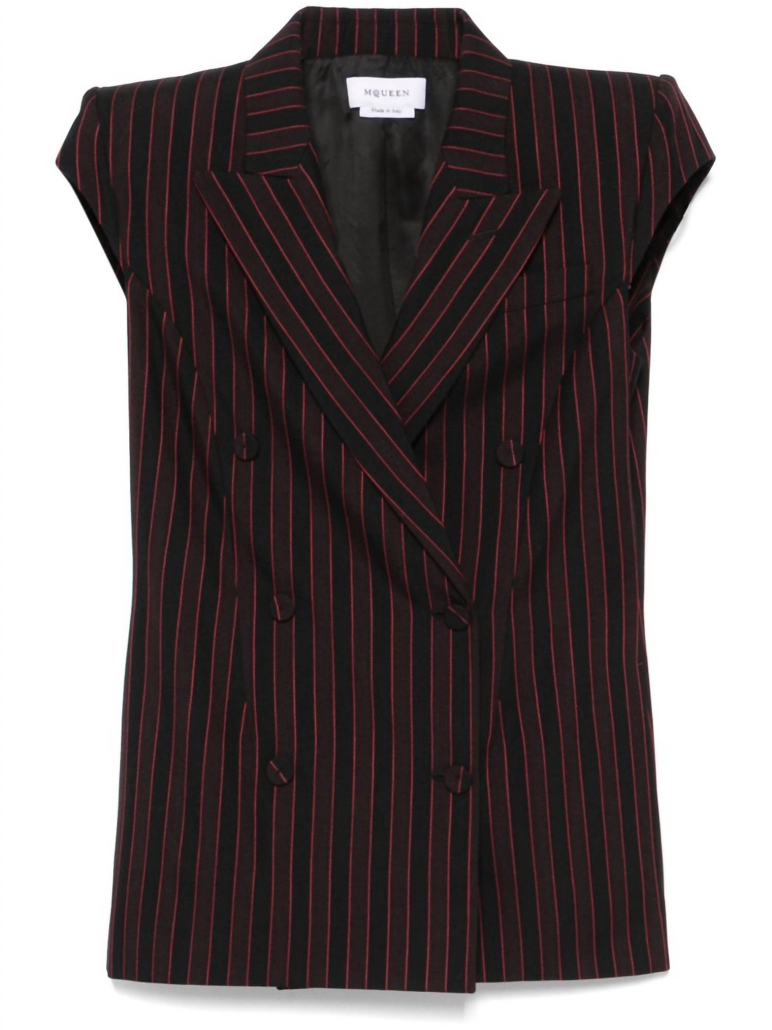 An elevated version of your favorite classic blazer. Elevate your travel wardrobe with the Pinstripe Sleeveless Blazer by Alexander McQueen, tailored for the modern woman. This striking blazer in a black/burgundy stripe features a double-breasted button closure and distinctive shoulder pads, offering a bold workwear-inspired look. Crafted from 100% wool with a cupro lining, it includes practical details such as two side inset pockets and a front welt pocket. For easy maintenance, machine wash and line dry this elegant piece.