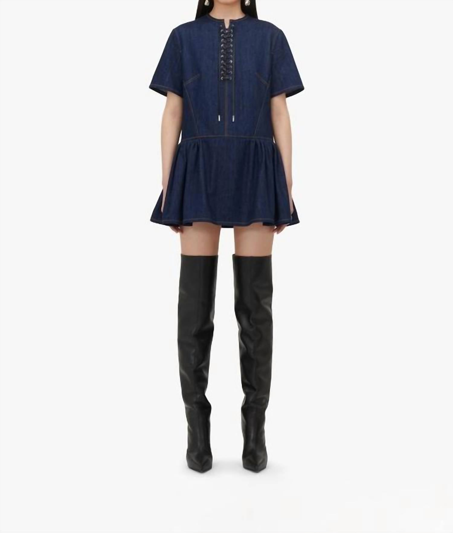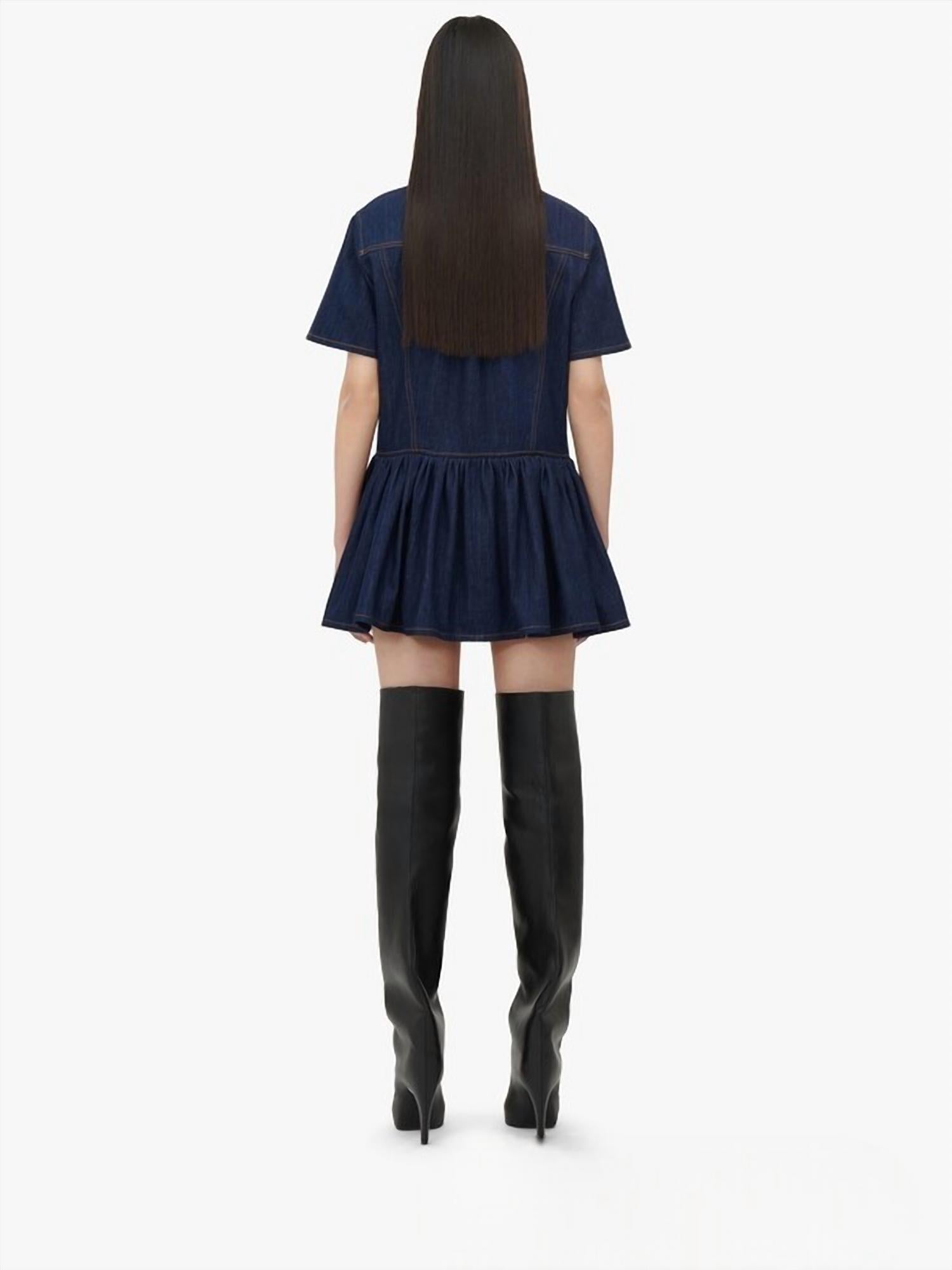 A short and breezy dress for those warmer days. Elevate your wardrobe with the Tiered Lace-up Topstitched Denim Dress by Alexander McQueen, a dark cold wash mini masterpiece crafted for an effortlessly chic appearance. Designed with a slightly loose fit, this shift dress features short sleeves and a crewneck. Made in Italy, it combines 100% cotton denim with a leather trim and a polyester-cotton lining for a luxurious feel. The dress is finished with a button-fastening keyhole at the back for a sophisticated touch.