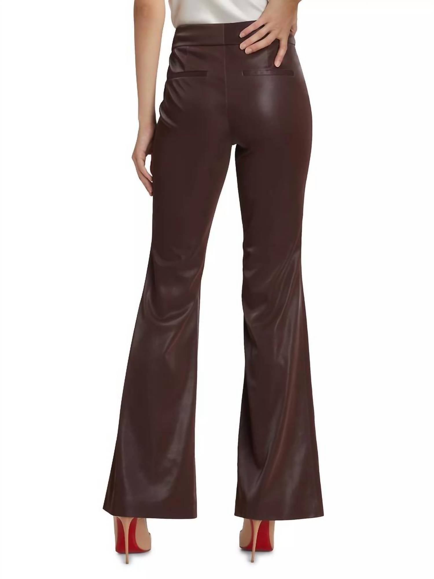 Introducing the Andrew Shiny Vegan Leather Bootcut Slim Pant by alice + olivia, an exquisite piece in the lush shade of espresso. Crafted from 100% polyurethane, these pants boast a sleek bootcut leg style with a mid-rise waist and a slim fit, offering a contemporary silhouette. Closure: Front hook and zip closure. Care: Dry clean only. The pant dimensions include a front rise of 10.25" and an inseam of 35".