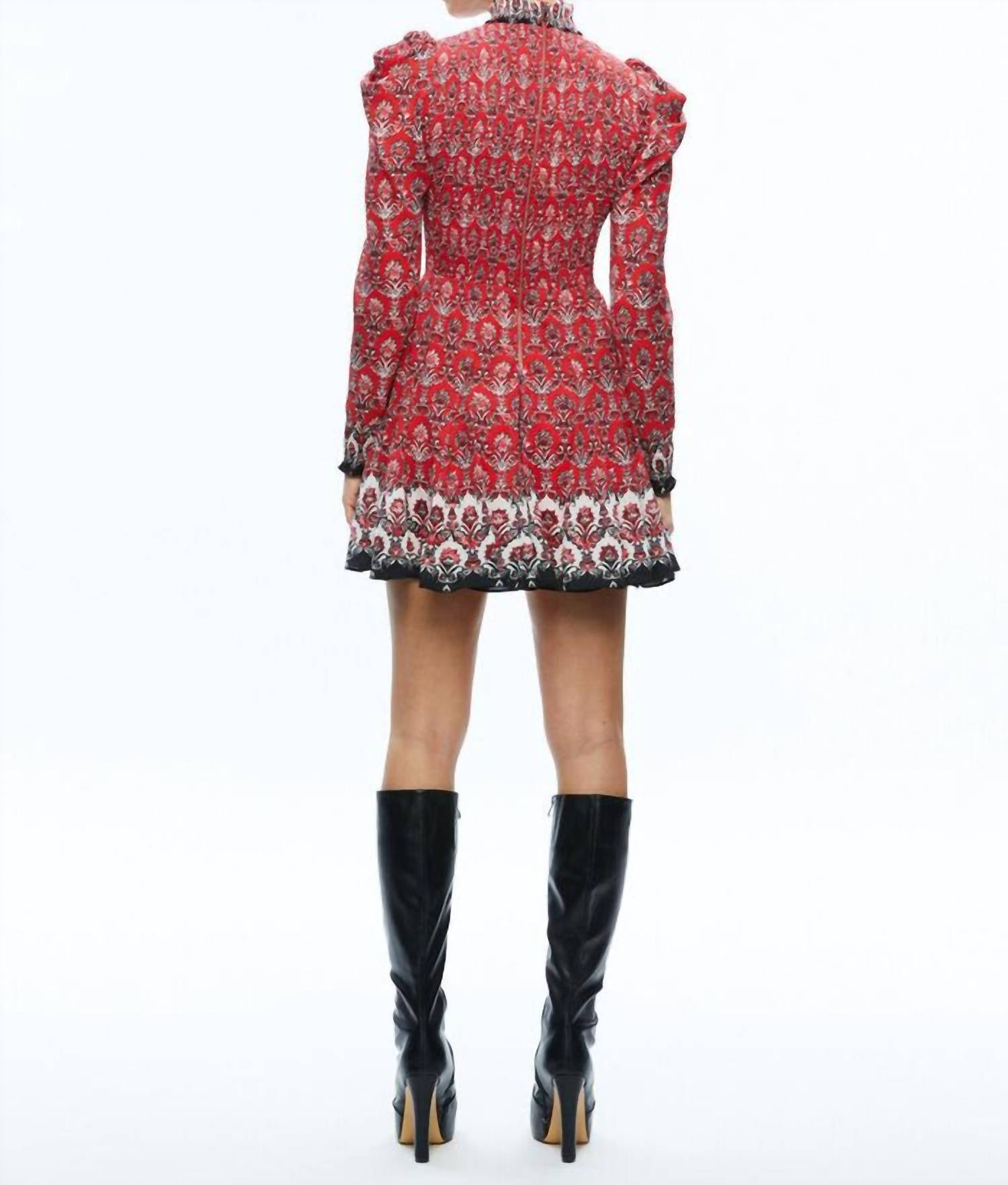 Presenting the Elvira Smocked Bodice Mini Dress by alice + olivia, a stylish option for any season in the striking Allure Medallion. This mini dress is crafted from 100% polyester and features long puff sleeves, a chic mock neck, and an elegant godet hem, with a smocked bodice for an enhanced fit. With a total length of 33 1/4", this A-line silhouette is completed with a back zip closure, adding a polished finish. Care: Dry clean only. The model, wearing size 2, is 5'10" with measurements of 32" bust, 22.5" waist, and 34.5" hip.