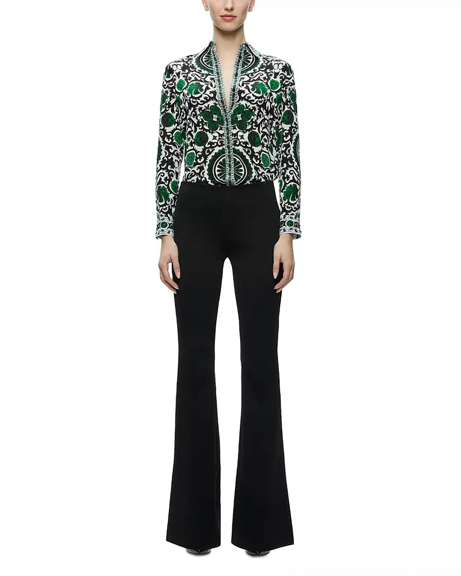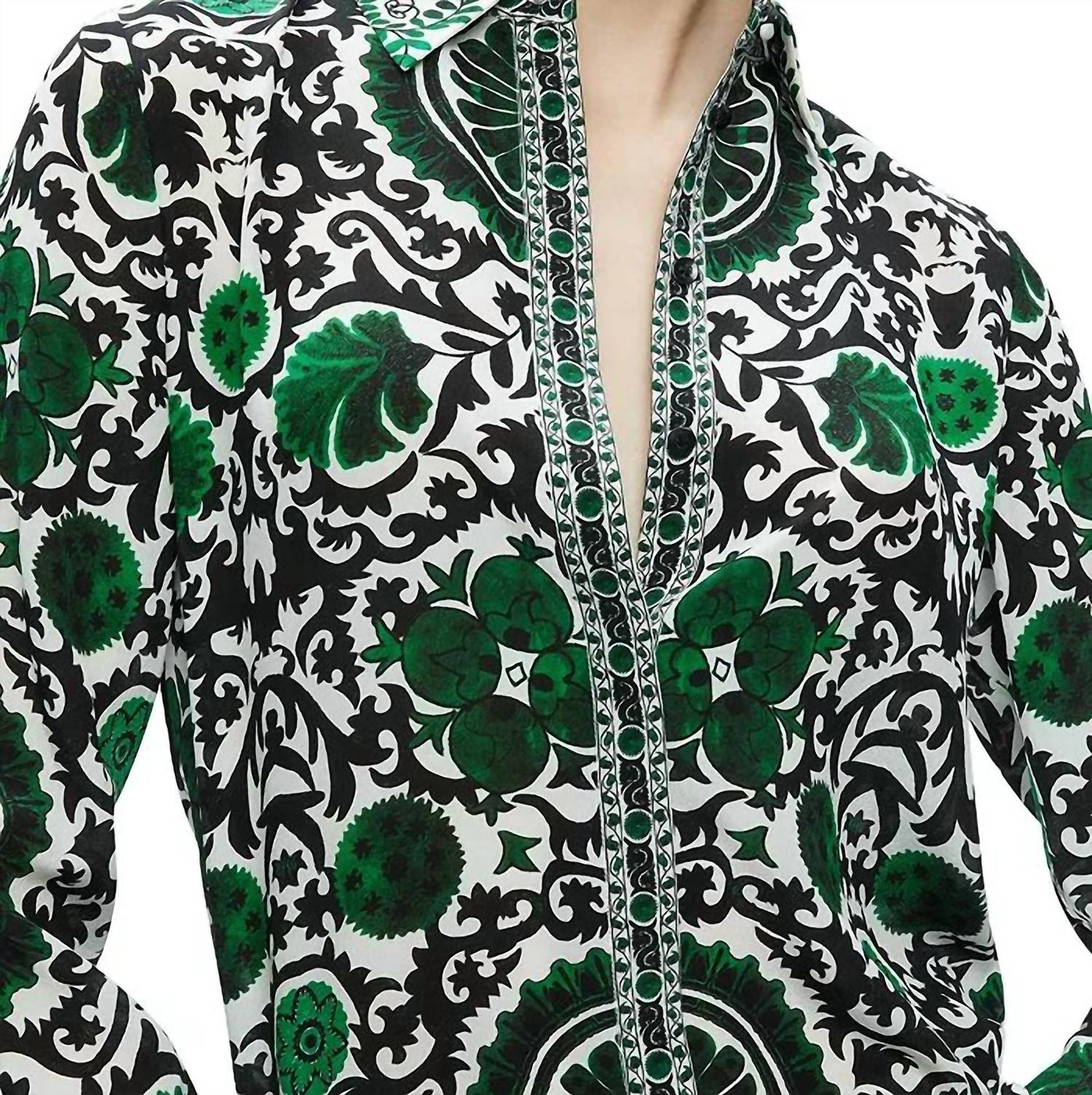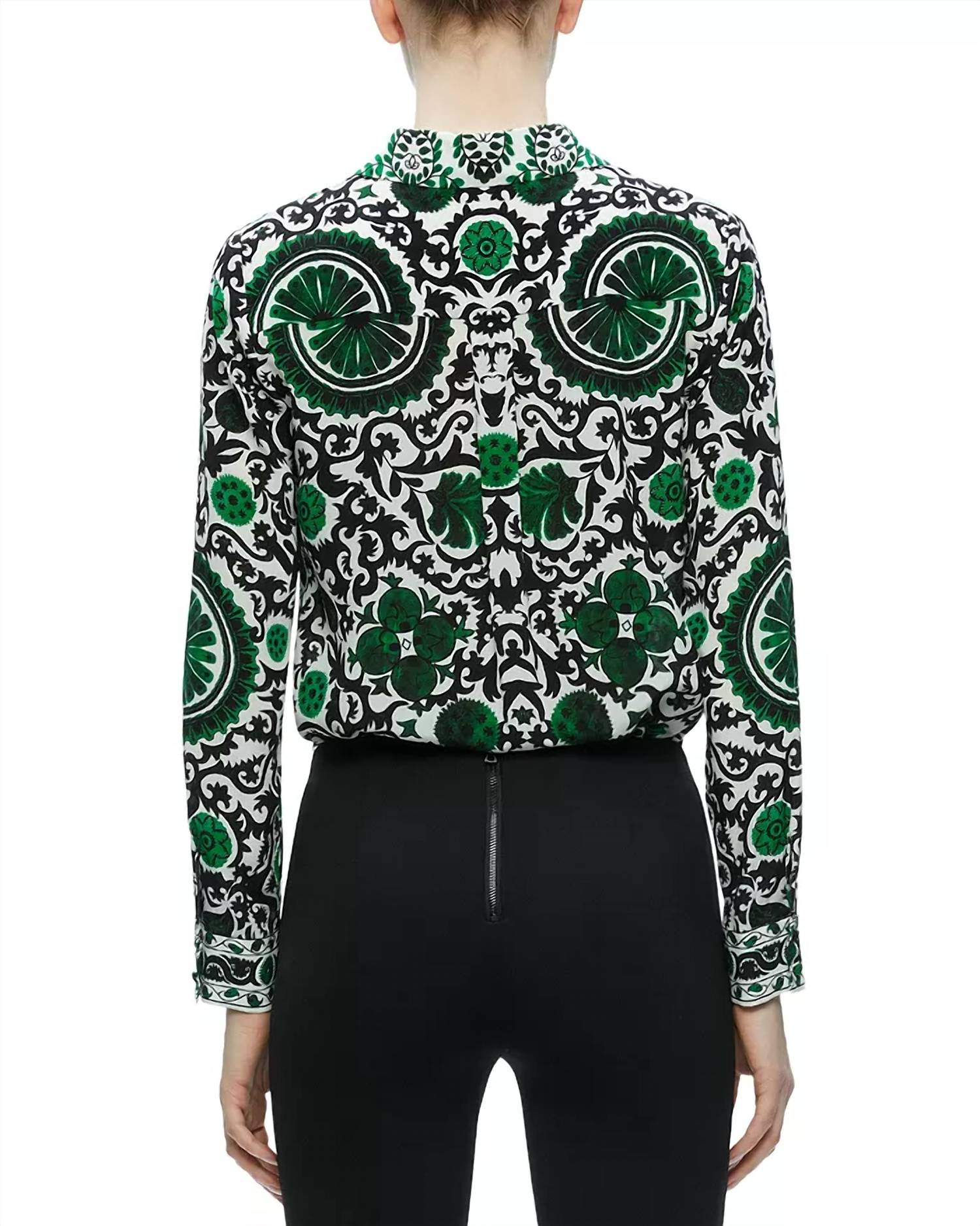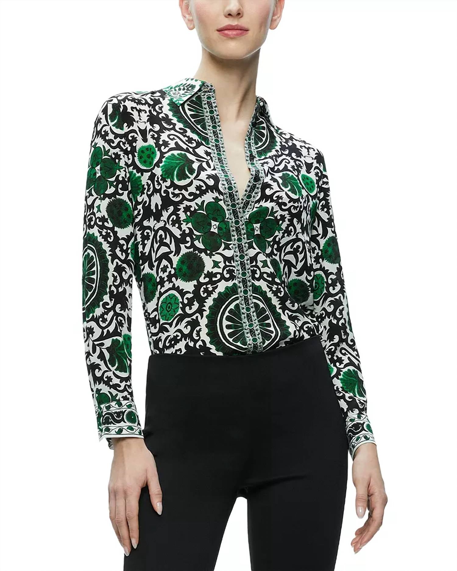 A classic button down shirt that will never go out of style. Introducing the Willa Placket Top by alice + olivia, a statement piece in vibrant colors that exudes elegance and confidence. This women's button-down shirt features long sleeves and a collared neckline, crafted from luxurious 100% silk with a hidden button closure for a sleek finish. Made with a total length of 24” and a delightful patterned design, it flatters with a relaxed yet polished fit. Originating from imported fabrics, this exquisite top requires dry clean care to maintain its quality, making it ideal for holiday parties or New Year's Eve celebrations. Model is wearing a size Small (5’10”, 32” bust, 23” waist, 34” hips).