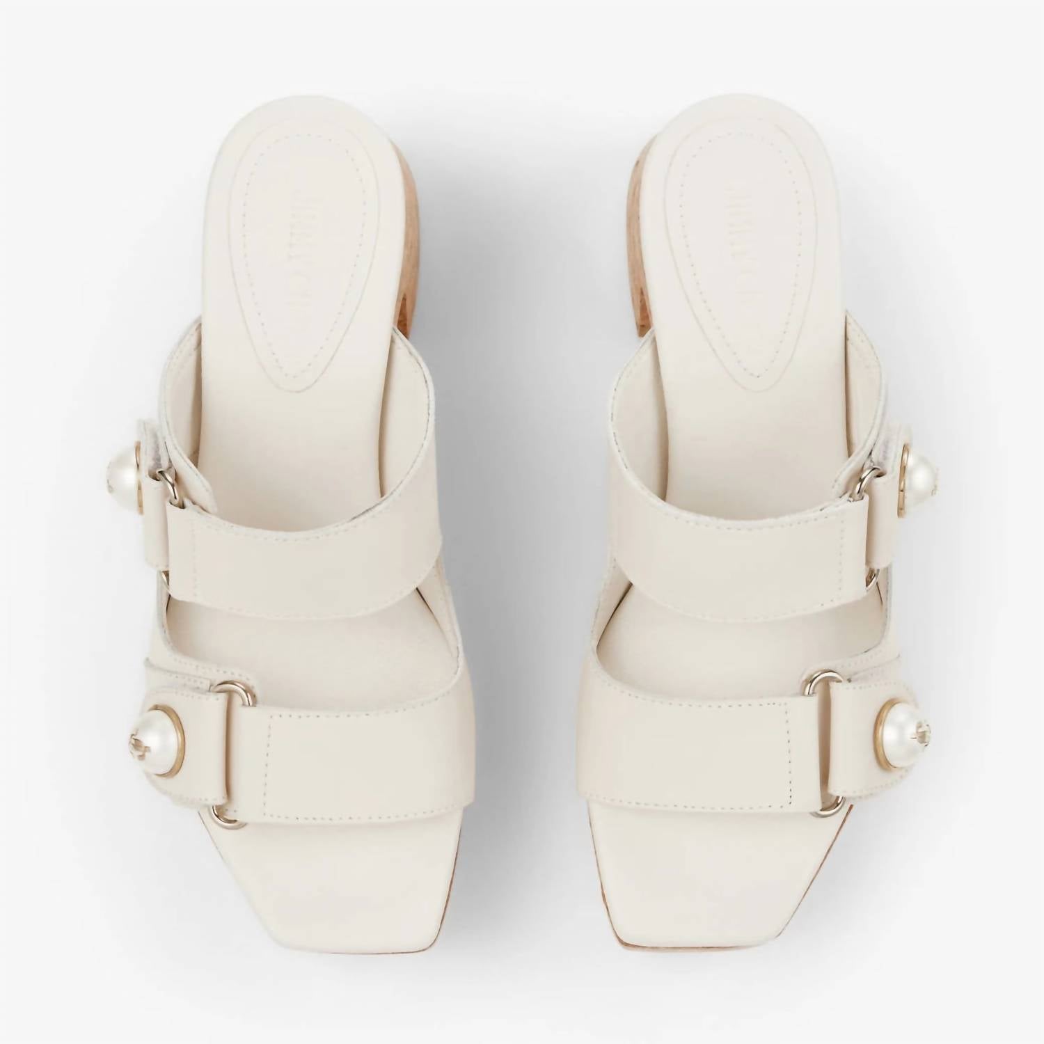 Don't be deceived, these heels are comfy as can be. Elevate your style this spring with the Women's Fayence Wedge by JIMMY CHOO, crafted with a luxurious leather upper in a chic latte hue. Featuring a slip-on silhouette with pearl-embellished straps and a velcro fastening closure adorned with gold-tone hardware, this wedge is both stylish and practical. The design includes a cork wedge platform heel at 95mm (3.7 inches) and a 45mm (1.7 inches) platform for extra comfort, complemented by a leather insole and rubber sole. Perfect for an Easter holiday party, these wedges blend sophistication and trend-forward workwear elegance.