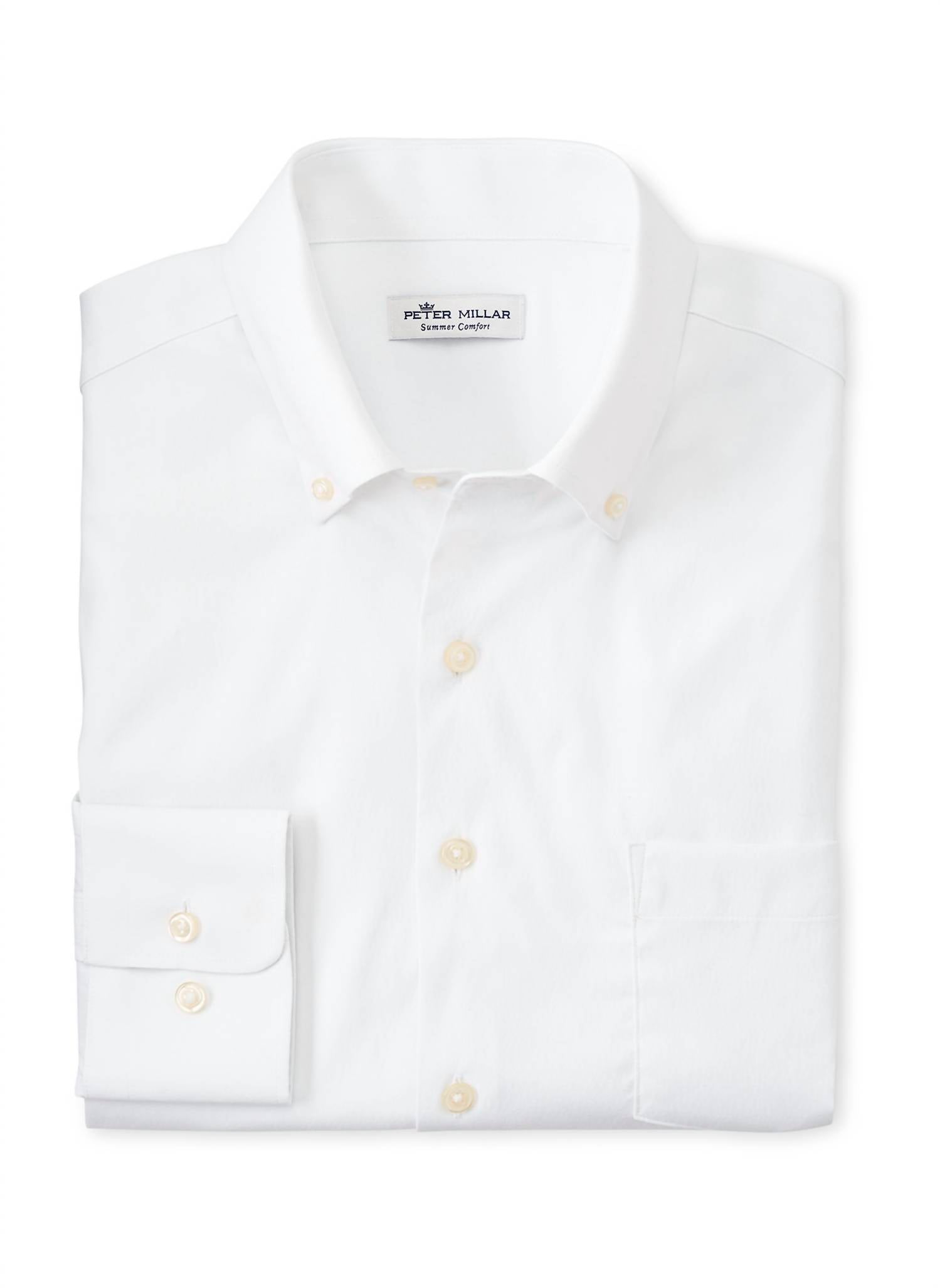 Discover the PETER MILLAR Colins Performance Oxford Sport Shirt, crafted for ultimate comfort and style. This men's long sleeve shirt is made from 100% polyester, offering a classic fit with a button closure. Designed with a button-down collar, French placket, and double-button barrel cuffs, it features two-way stretch and moisture-wicking properties, providing UPF 50+ sun protection. Care for this shirt by machine washing and laying flat to dry.