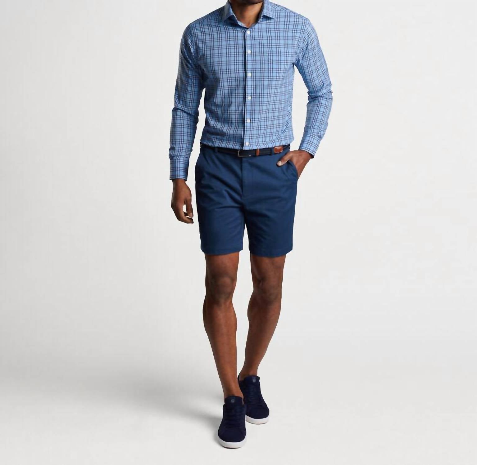 Two-way stretch. Moisture-wicking and UPF 50+ sun protection. Classic plaid pattern. Spread collar and a French placket. 100% polyester. Machine wash cold with like colors; Lay flat to dry.