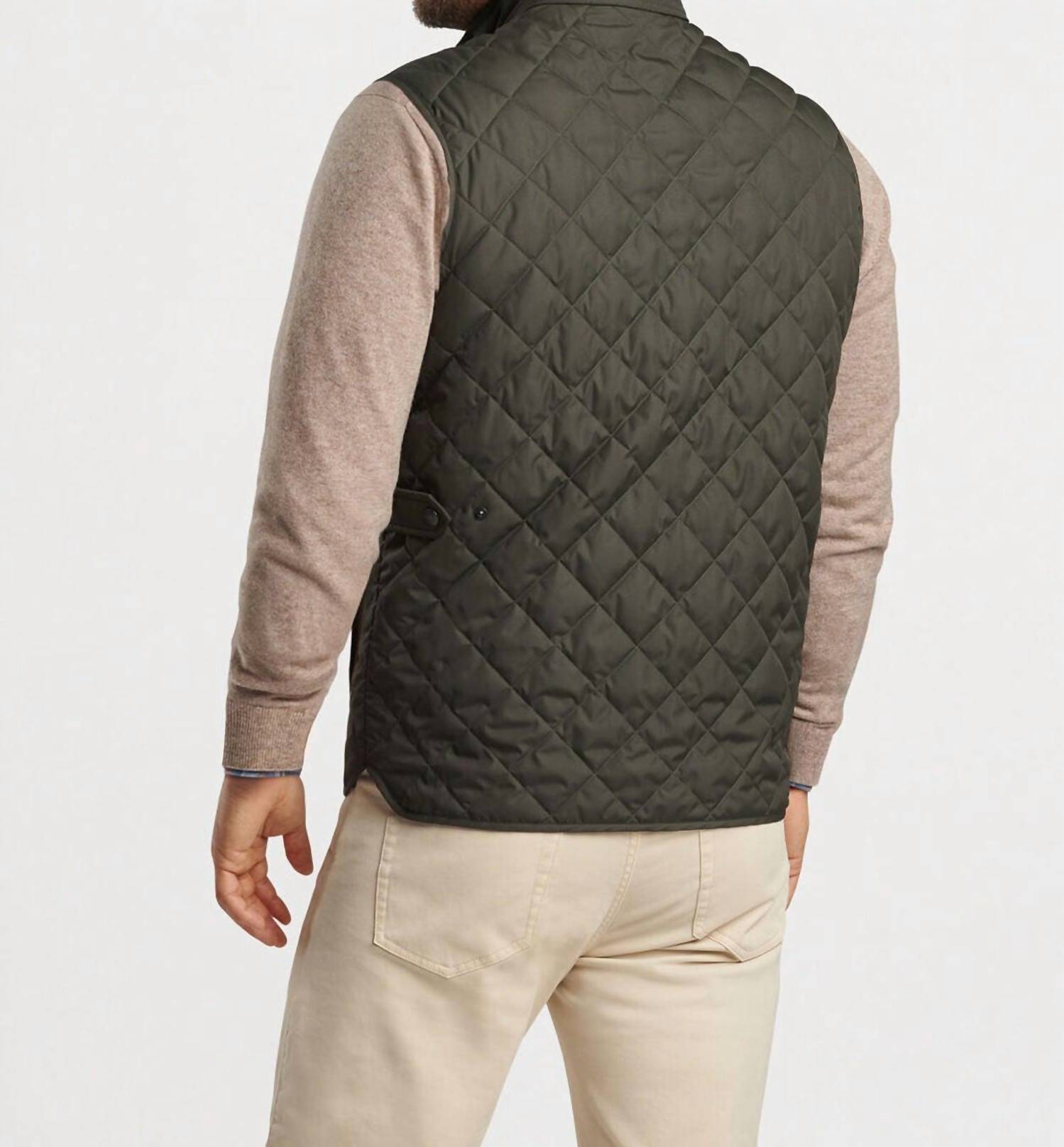 Introducing the Peter Millar Essex Vest in Dark Olive, a stylish piece perfect for the modern man. This sleeveless vest is crafted from 100% recycled polyester, featuring a textured pattern and a sleek matte finish. With a classic fit, it includes convenient pockets and a secure zip closure for easy wear. Carefully machine wash cold with like colors and lay flat to dry to maintain its quality.