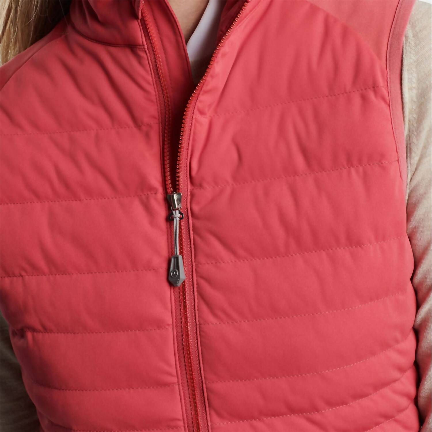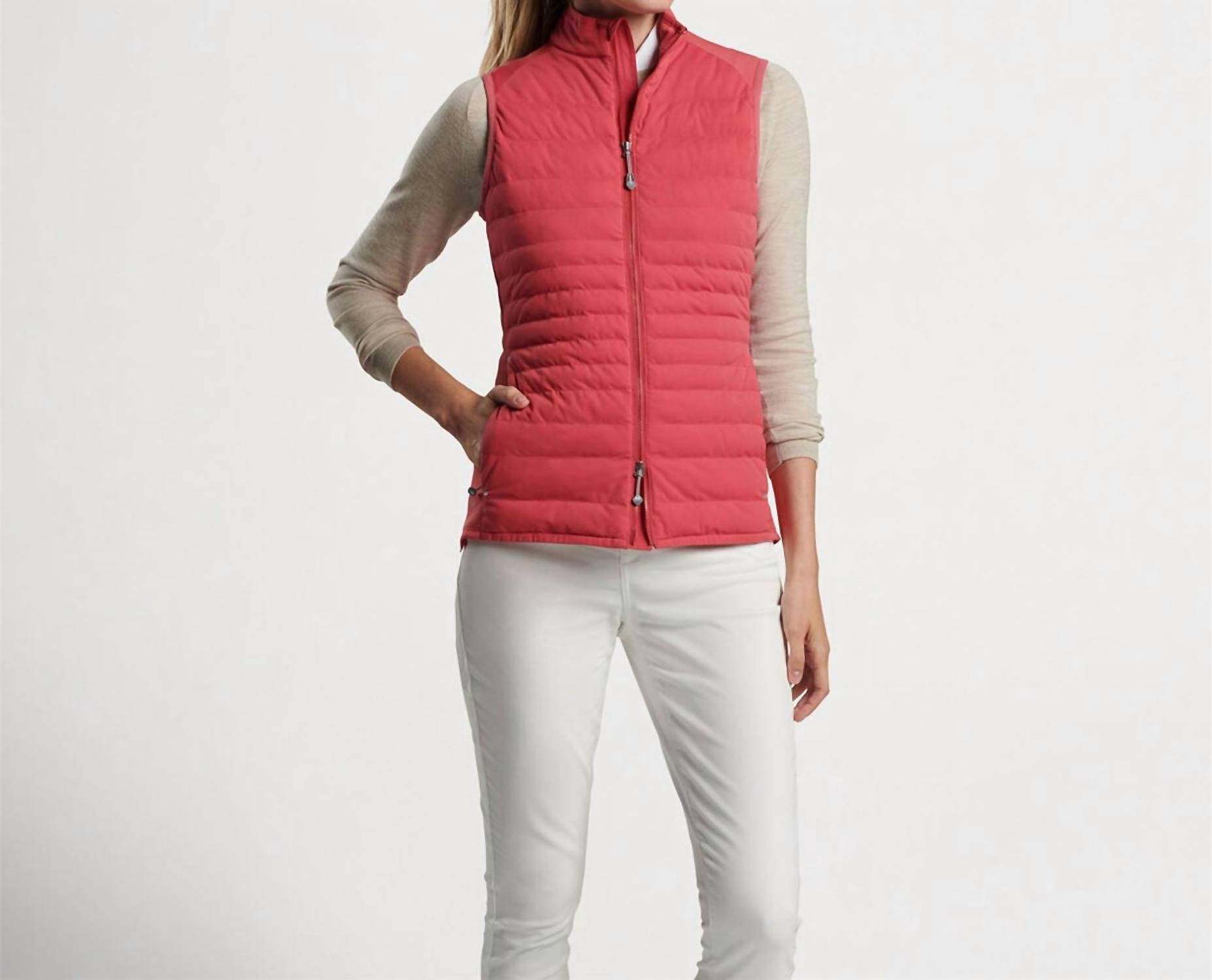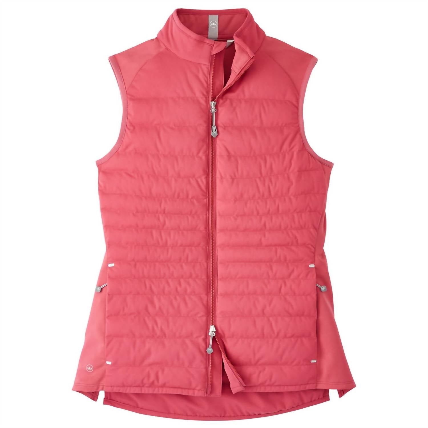 A vest so versatile you can mix and match it with almost any outfit and it will feel brand new every time. Enhance your outerwear collection with the Fuse Hybrid Vest by PETER MILLAR in a striking Cape Red textured finish. This women's sleeveless vest features a 100% polyester shell with 80% polyester and 20% spandex side panels for ultimate comfort and flexibility. The vest is designed with a two-way zip closure and practical side entry pockets, ensuring functionality meets style. Crafted for resilience with wind and water resistance, it's easy to maintain with a machine wash cold routine and low tumble dry.