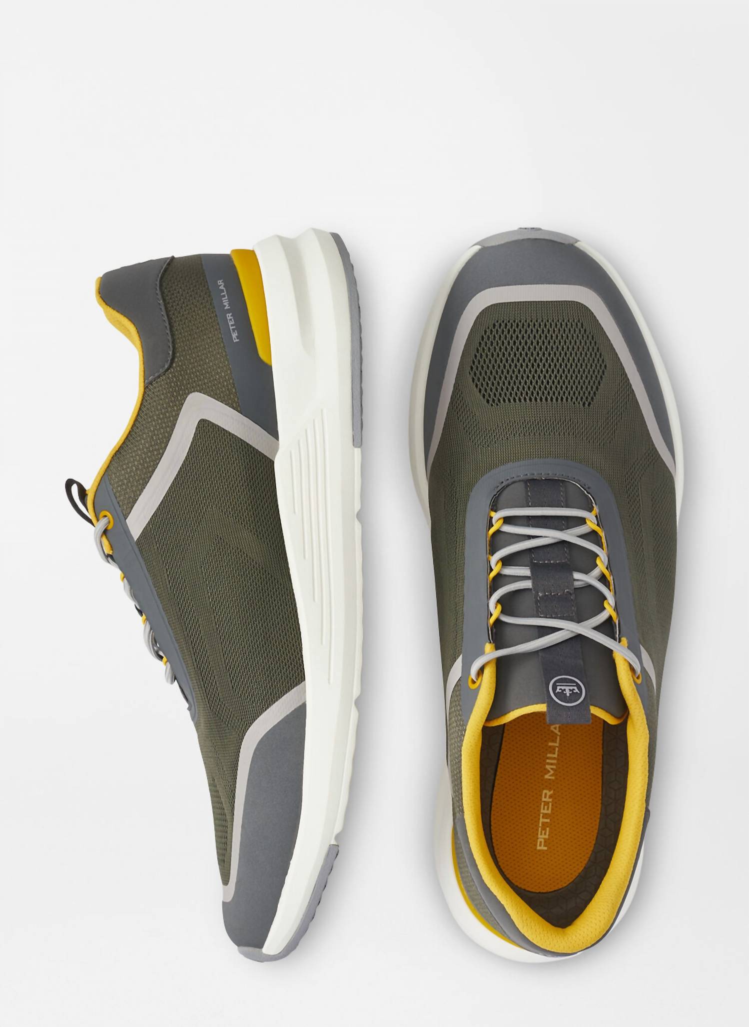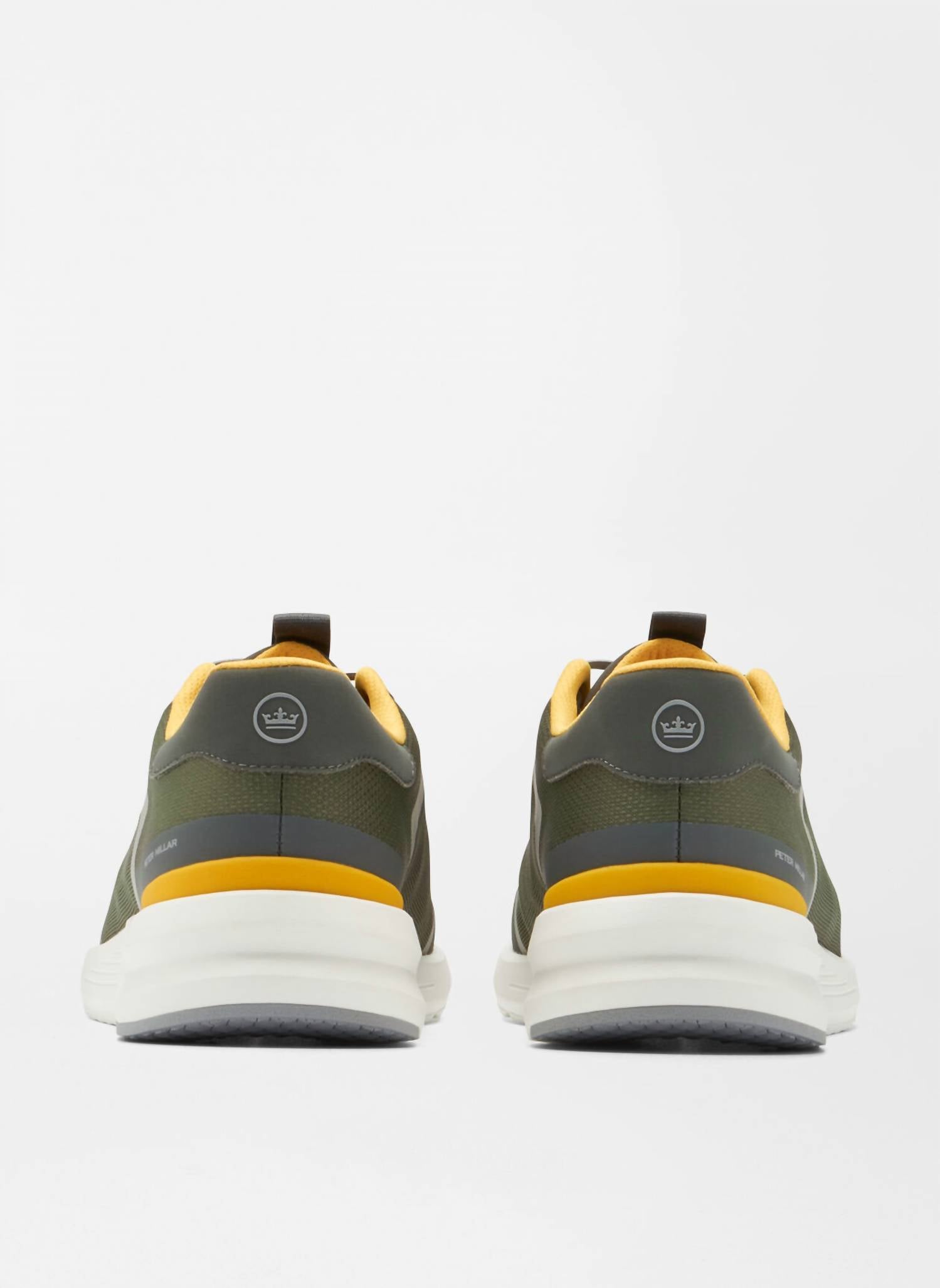Introducing the Men's Camberfly Sneaker by Peter Millar in a sophisticated Olive Leaf hue, designed for both performance and style. This innovative sneaker features polyester uppers for enhanced breathability and an ergonomic outsole shaped like an arc, supporting your natural stride with ease. With an interior foam heel cup and hexagonal pads on the sole, expect unmatched comfort and durable traction for all-day wear. The elastic laces offer effortless slip-on convenience, making these sneakers a perfect blend of technical performance and athletic elegance.