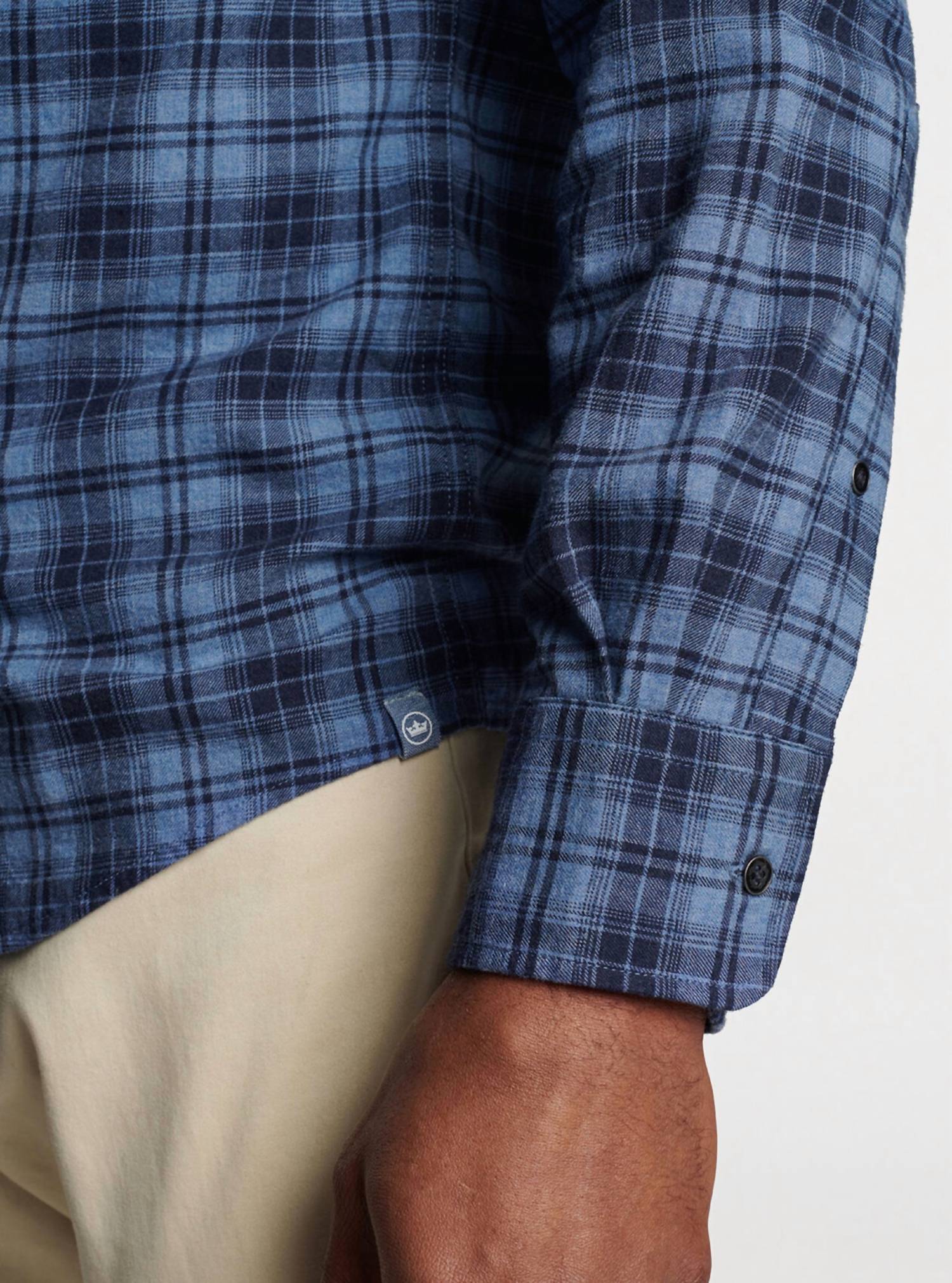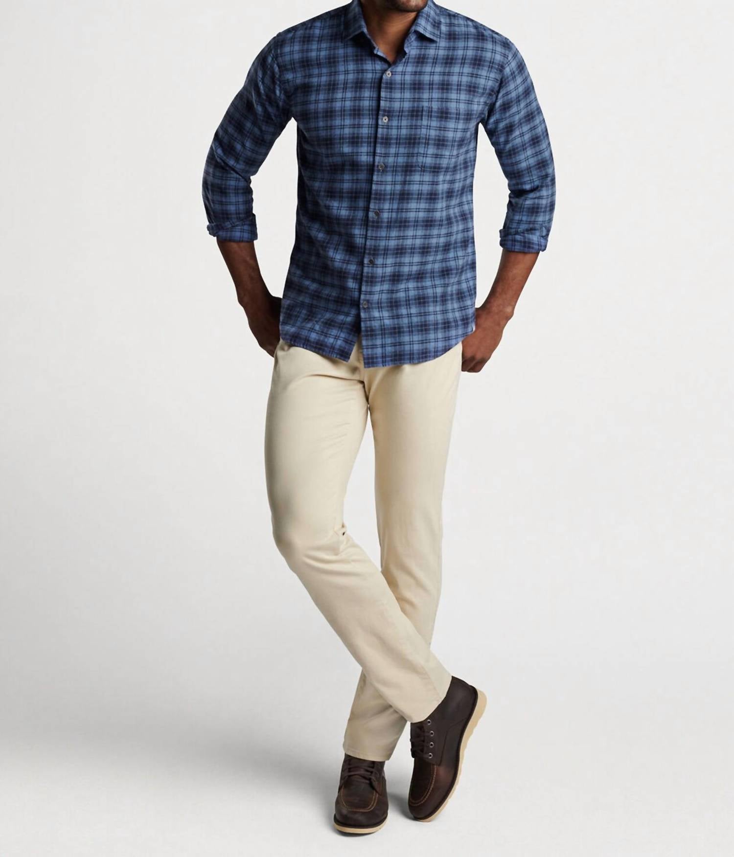 Introducing the Men's Crestline Cotton Sport Shirt by PETER MILLAR, a perfect choice for casual wear. Featuring long sleeves and a collar neckline, this Twilight Blue shirt is crafted from ultra-soft cotton, ideal for staying comfortable all day. The sport shirt is designed with a shorter length to be worn untucked, complemented by a button closure with antiqued buttons for a rugged look. Care is straightforward with machine wash instructions and lay flat to dry.