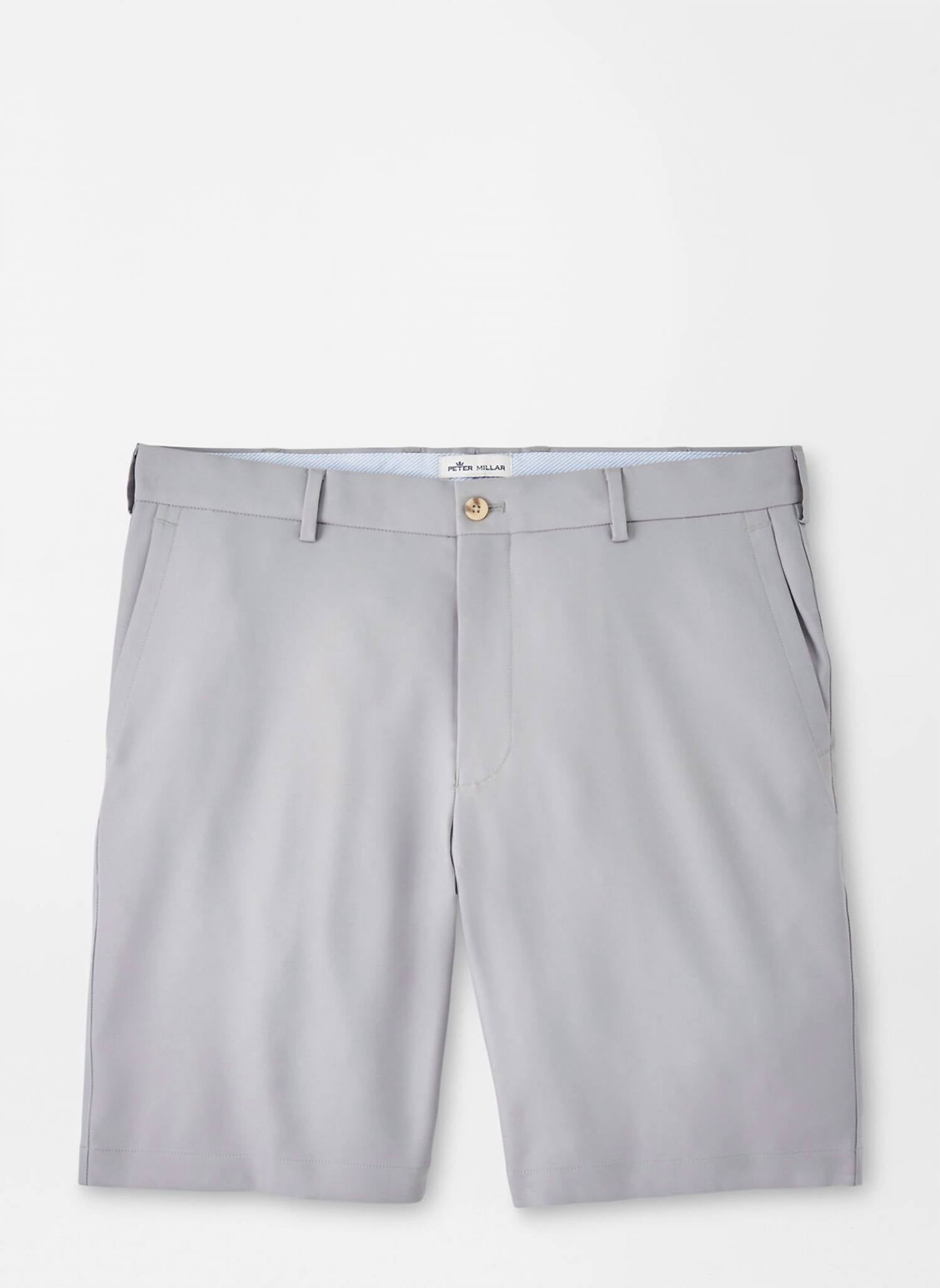 Classic Fit. 9" inseam. Two-way stretch, moisture-wicking and easy-care. Belt loops and zip fly with button closure. Machine wash cold.