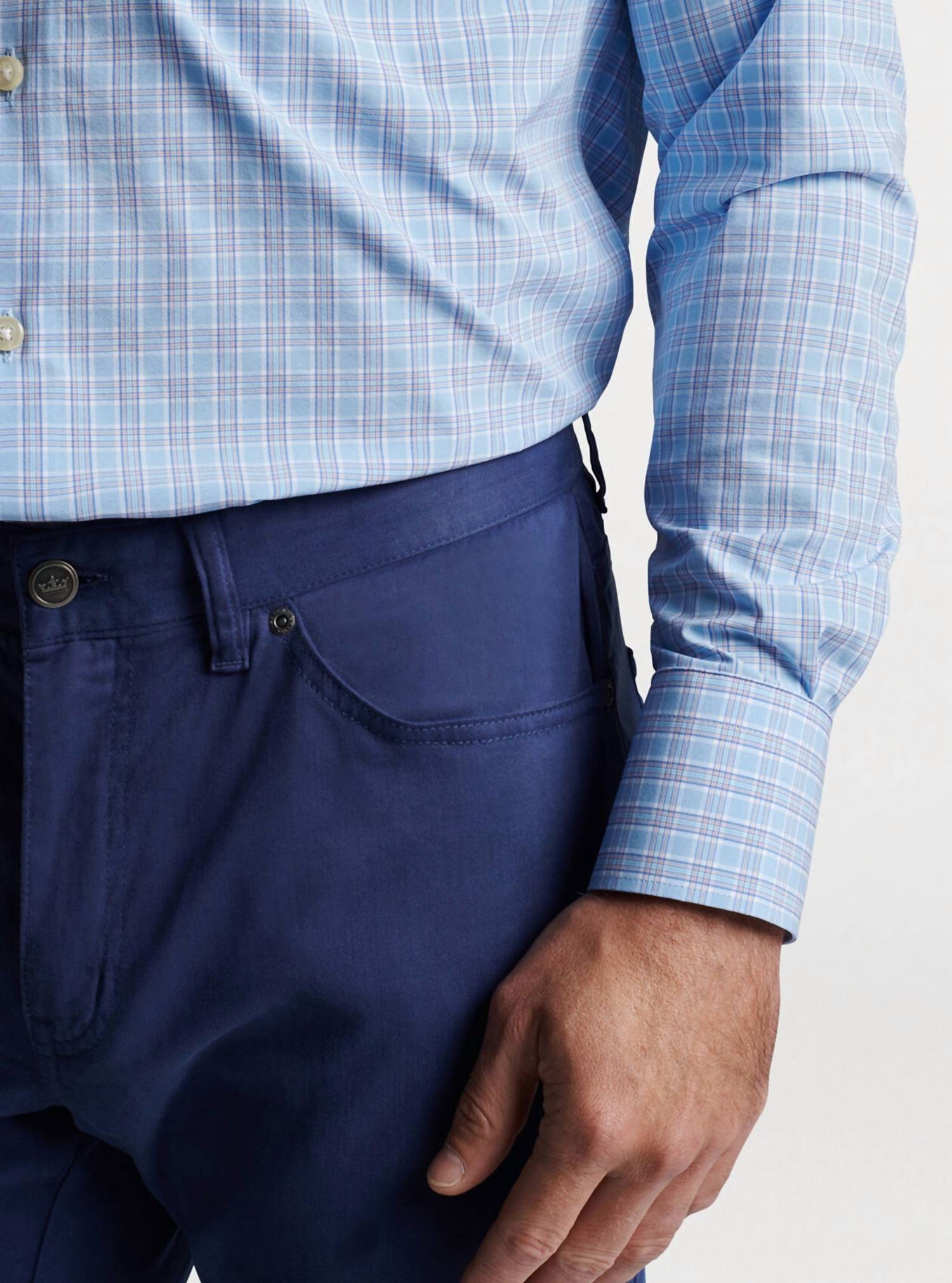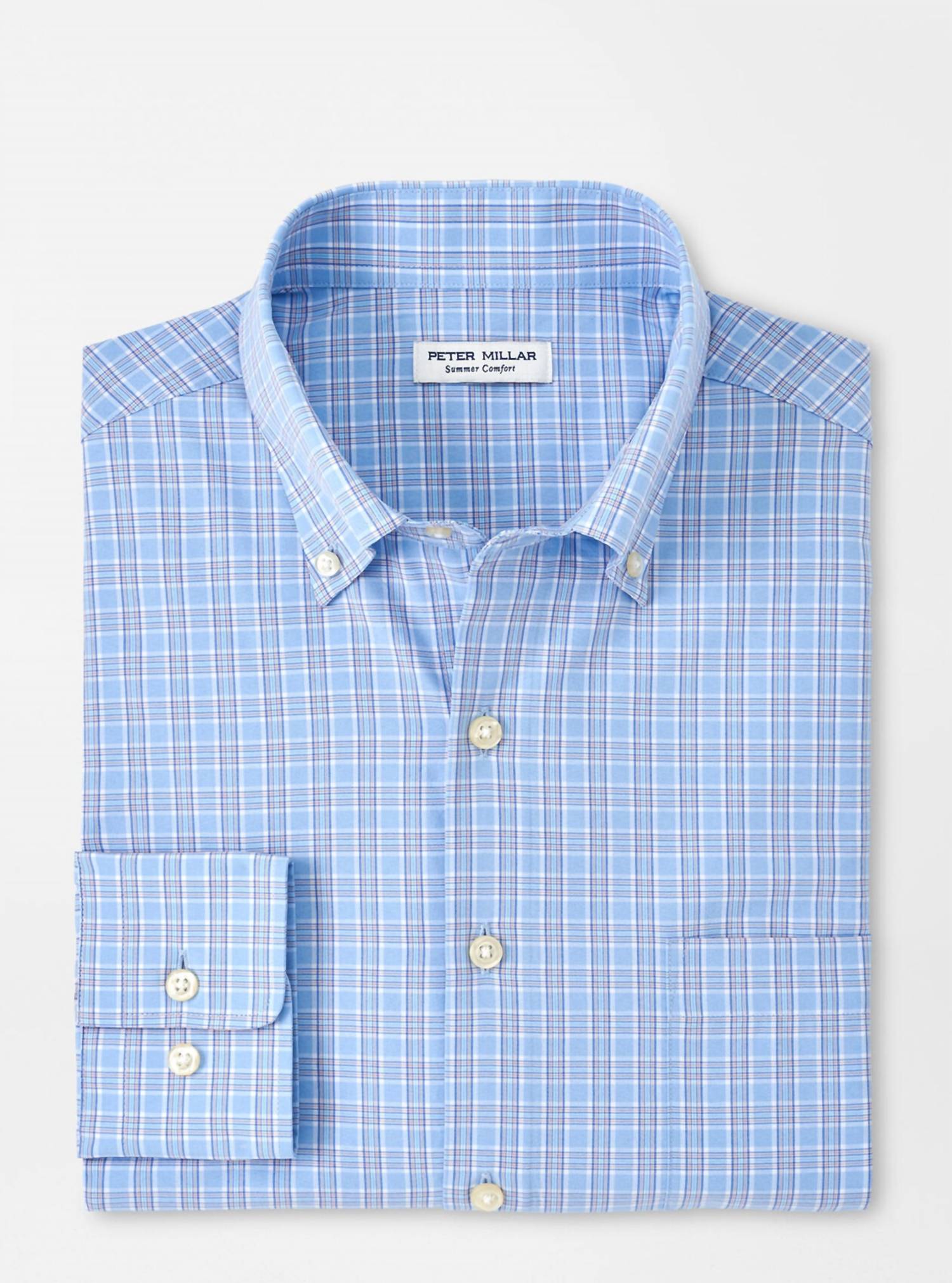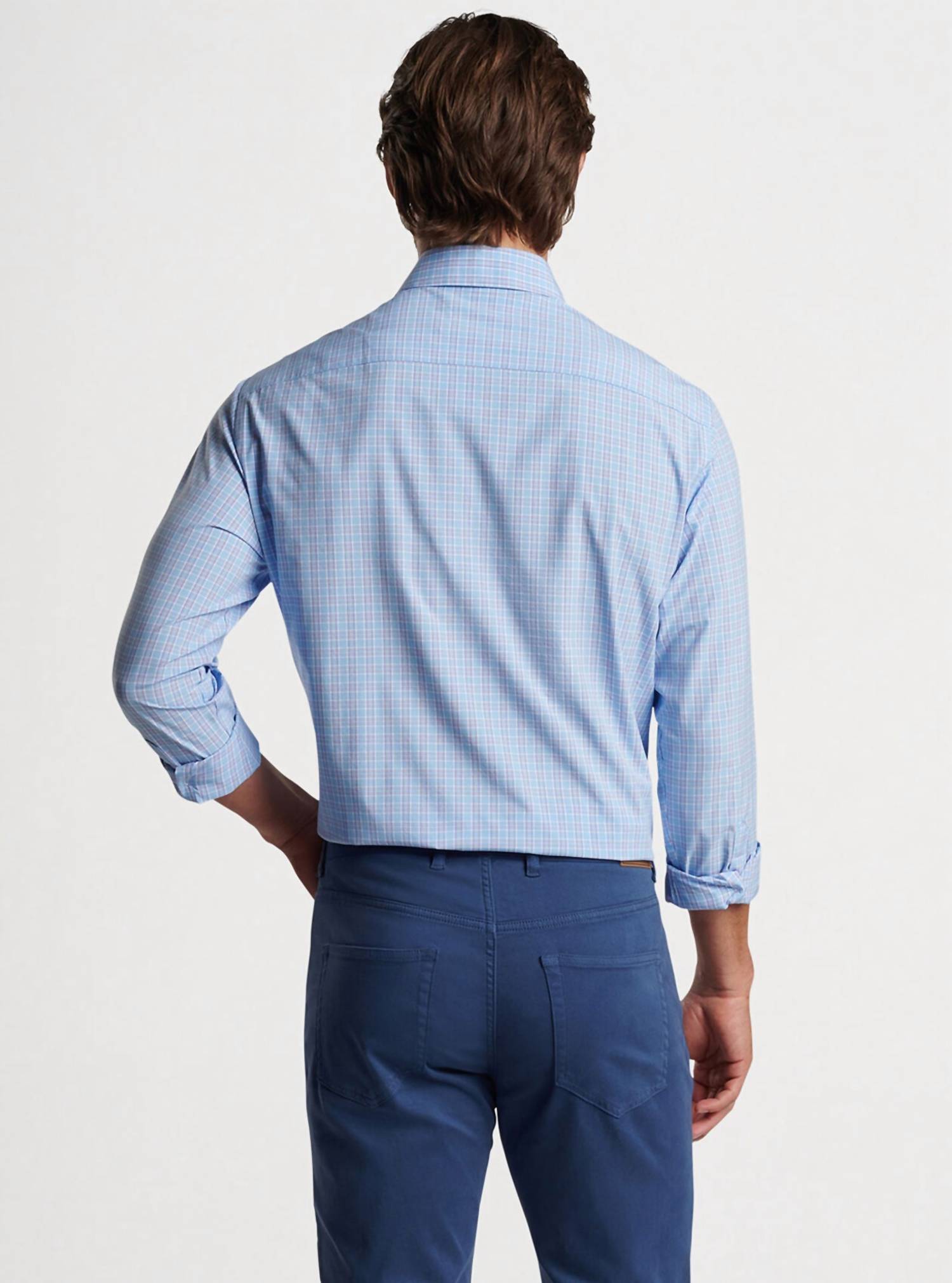 Discover the Men's Murphys Performance Poplin Sport Shirt by PETER MILLAR, crafted for unparalleled comfort and classic style. This shirt in Cottage Blue features long sleeves and a button closure, enhanced with a button-down collar, French placket, and double-button barrel cuffs. Made with two-way stretch fabric, it offers moisture-wicking and UPF 50+ sun protection, perfect for versatile wear. Care for it with ease by machine washing and laying flat to dry.