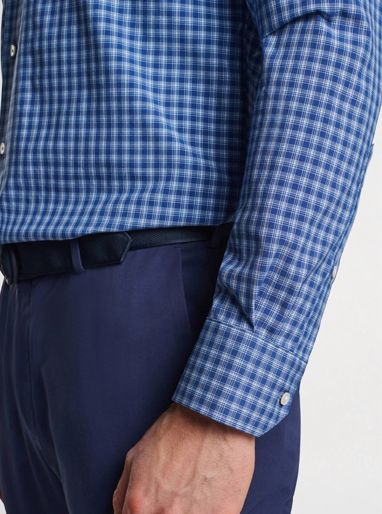 The Men's Whipple Performance Poplin Shirt by Peter Millar offers a sophisticated take on the classic navy plaid with long sleeves. Crafted from a dynamic performance fabric, it provides two-way stretch, moisture-wicking properties, and UPF 50+ sun protection. The shirt is designed with a button-down collar, French placket, and mitered cuffs, ensuring both style and practicality. Care instructions are machine wash and lay flat to dry.