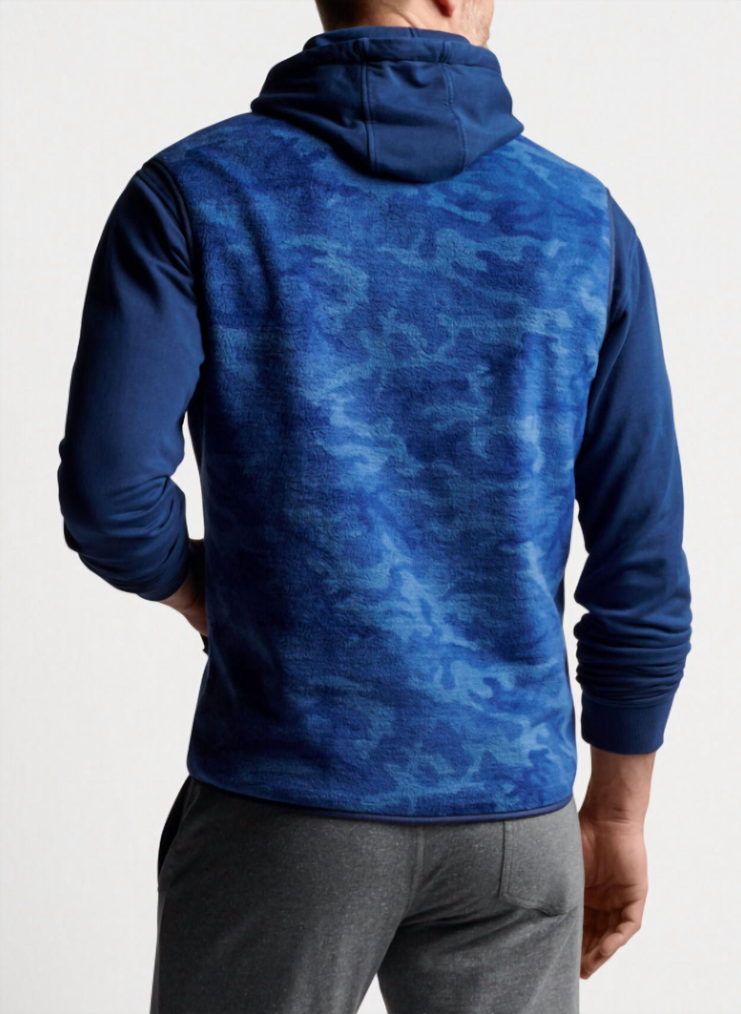 Atlantic Blue sleeveless men's vest. Crafted from 100% polyester with a cozy brushed fleece exterior. Features a stylish patterned design. Includes contrast piping and practical two-way zip closure, complemented by two convenient side zip pockets. For care, machine wash cold with like colors and lay flat to dry or opt for dry cleaning.