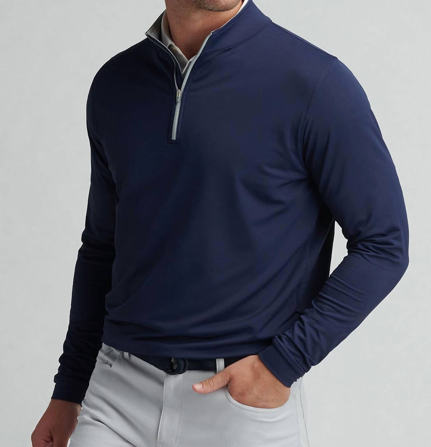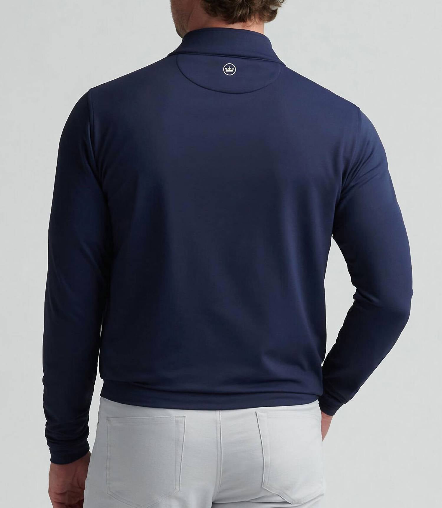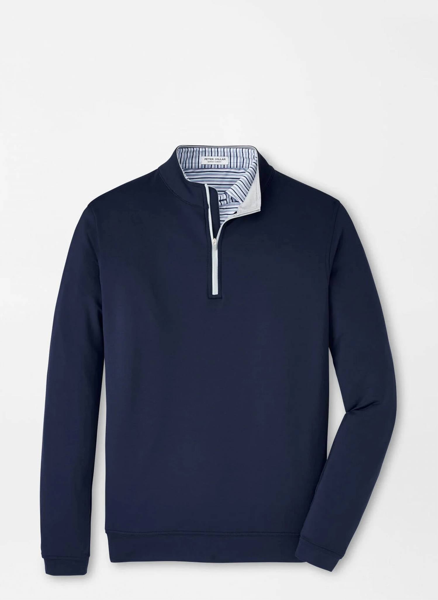 The Perth Performance Quarter Zip Sweater by Peter Millar combines classic style with advanced performance features. This men's pullover in navy features long sleeves and a mock collar, crafted from a blend of 89% microfiber polyester and 11% spandex with stretch French terry for optimal flexibility. Designed with a zip closure, it offers four-way stretch, moisture-wicking, and easy-care benefits. Care instructions include machine washing cold with like colors and tumble drying low. Origin: Imported.