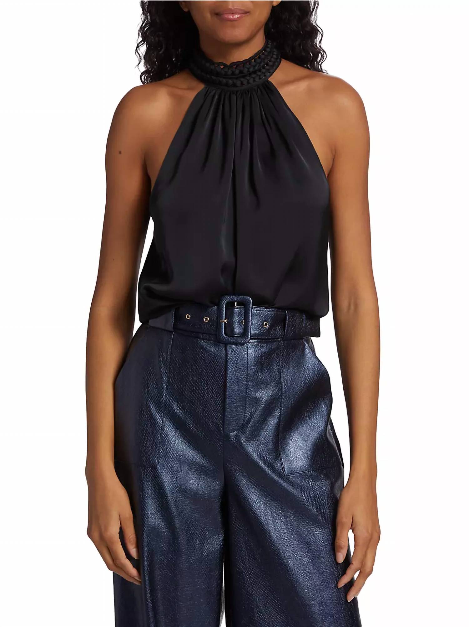 The perfect tank top for those warmer weather seasons.This Braided Halter Top features luxurious satin charmeuse for a lustrous sheen and flattering drape. The intricate braided halterneck design adds sophistication, while the back keyhole cutout with a hook-and-eye closure offers a modern touch. Made from 100% polyester. Dry clean only.