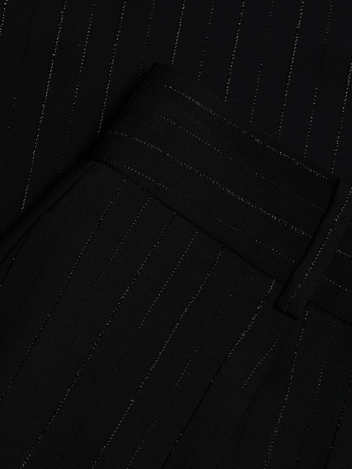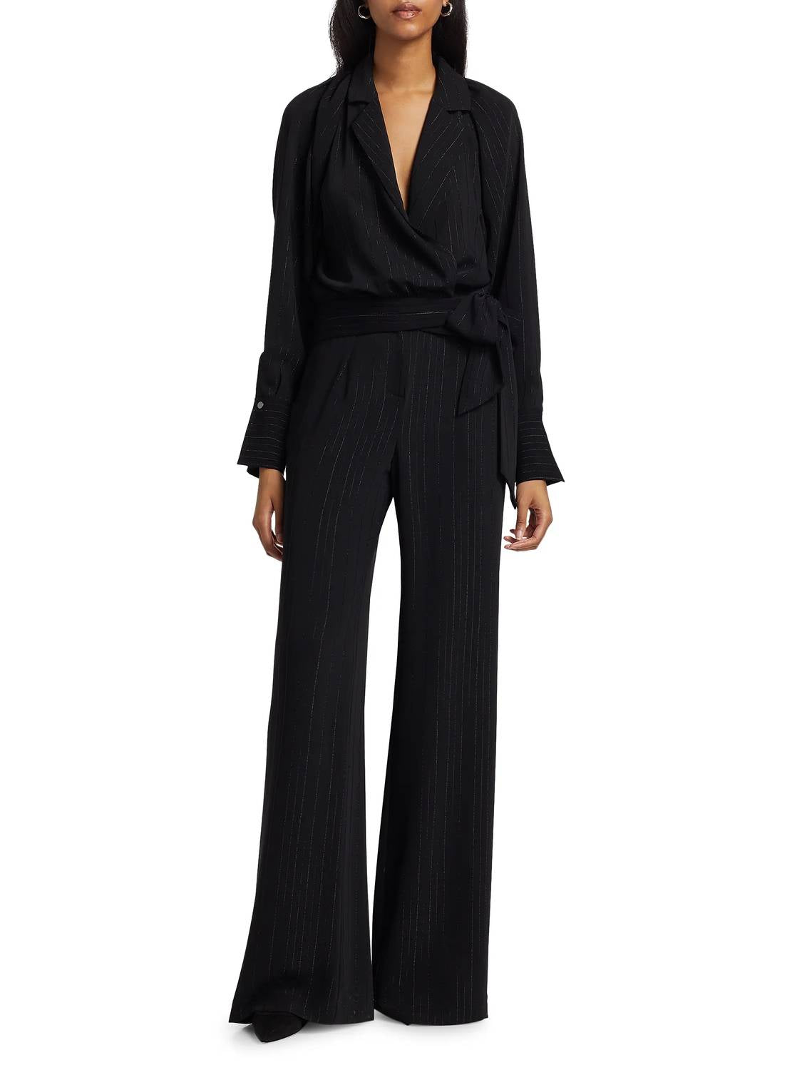 Ramy Brook's Gaius pants blend classic workwear with a whimsical touch featuring a metallic pinstripe pattern. Cut in a straight-leg silhouette, this piece features a mid-rise banded waist and side slash and back besom pockets. Band waistband, belt loops Pleated front Side slash pockets Back besom pockets Zip fly, button closure 99% polyester/1% metallic fibers Dry clean Imported