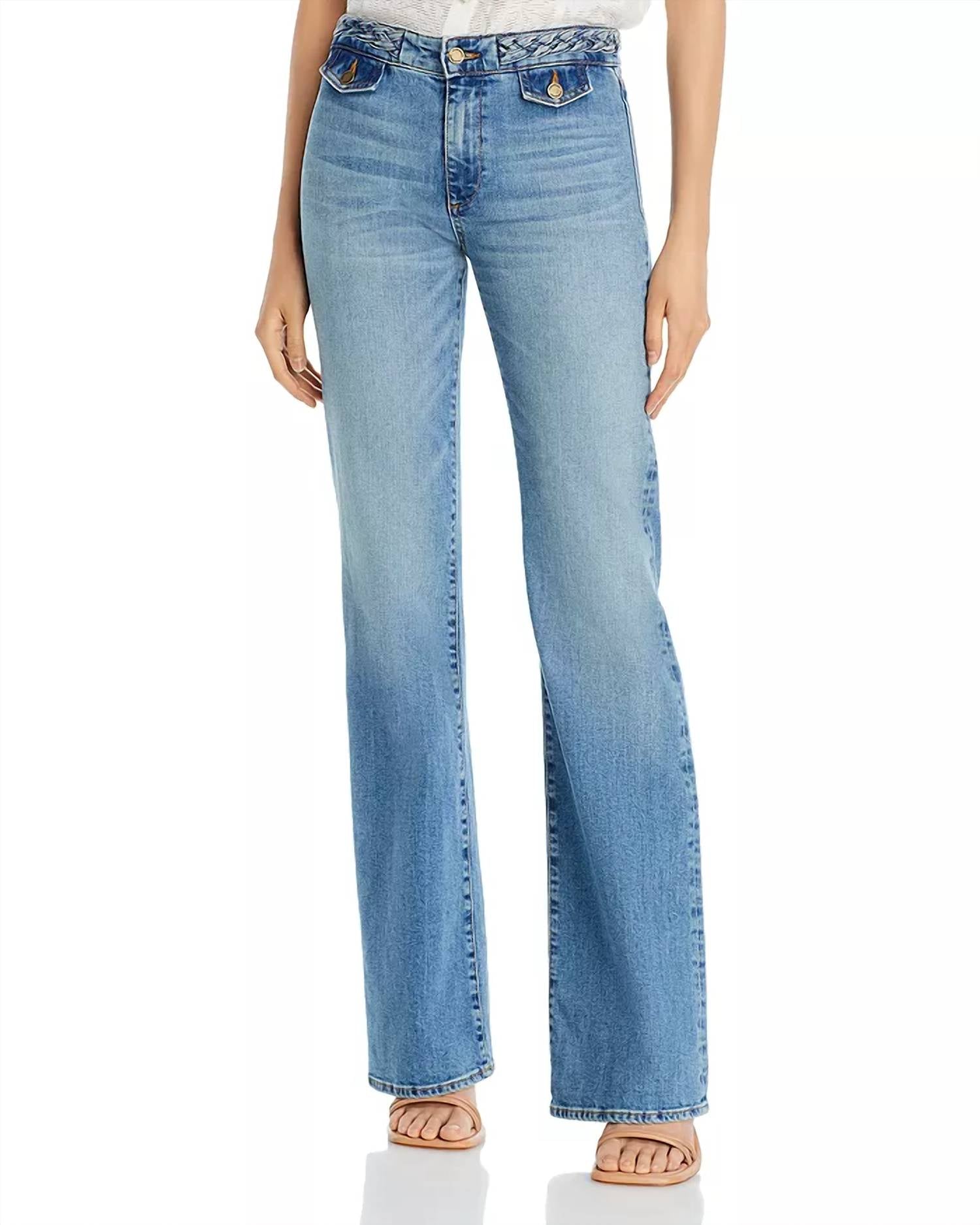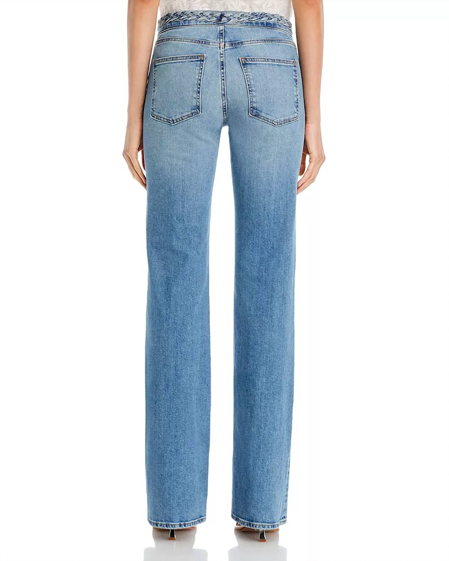 Pair these wide leg jeans with mules, slides or your favorite strappy sandals. Discover the perfect blend of style and comfort with the Itzel Wide Leg Jeans by Ramy Brook, crafted from a soft and stretchy blend of 98% cotton and 2% polyurethane. Chic braided waistband and a zip fly with button closure, ideal for effortless day-to-night transitions. They boast faux front flap pockets and patch back pockets, along with a faded and whiskered straight-leg silhouette for a touch of vintage flair. Care for these jeans easily with machine wash and tumble dry, ensuring they maintain their flattering fit and vibrant color over time. Dimensions for size 26 are a rise of 8", inseam of 31", and leg opening of 21", modeled by a 5'10" individual with a 33.5" bust, 23.5" waist, and 34.5" hips.