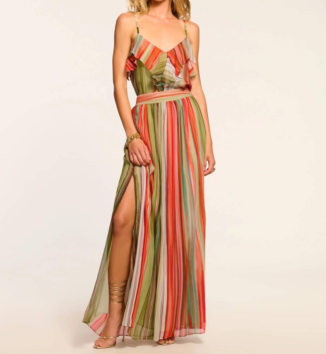Introducing the Lanette Silk Chiffon Maxi Skirt by Ramy Brook, a stunning piece in mint stripes designed for a breezy beach day. This maxi skirt, crafted from 100% silk, features a dynamic slit and an elastic back waist for ease of movement. Closure: Side zipper. Care: Dry clean or hand wash.