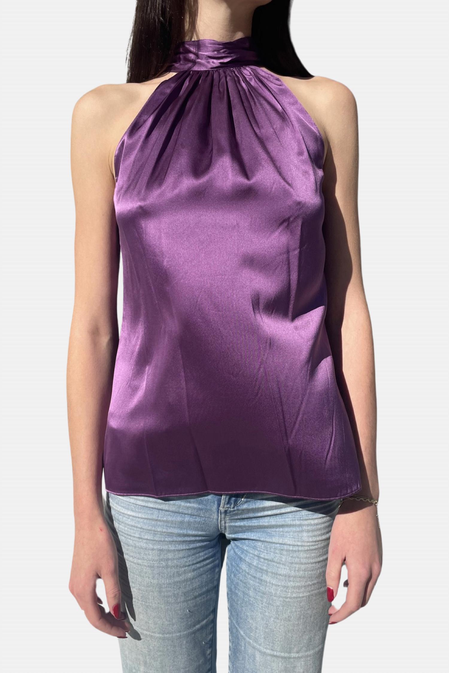 Pair this with your favorite jeans and slides for your next girls night out. Experience the timeless elegance of the Lori Silk Halter Top by Ramy Brook, crafted in a luxurious Mulberry hue. This sleeveless blouse boasts a 95% Silk and 5% Spandex composition, providing a silky feel with a touch of stretch. The pull-on design features a versatile bow-adorned high neck that can be styled front or back, allowing for a chic keyhole detail. For care, simply dry clean to maintain its sophisticated allure.