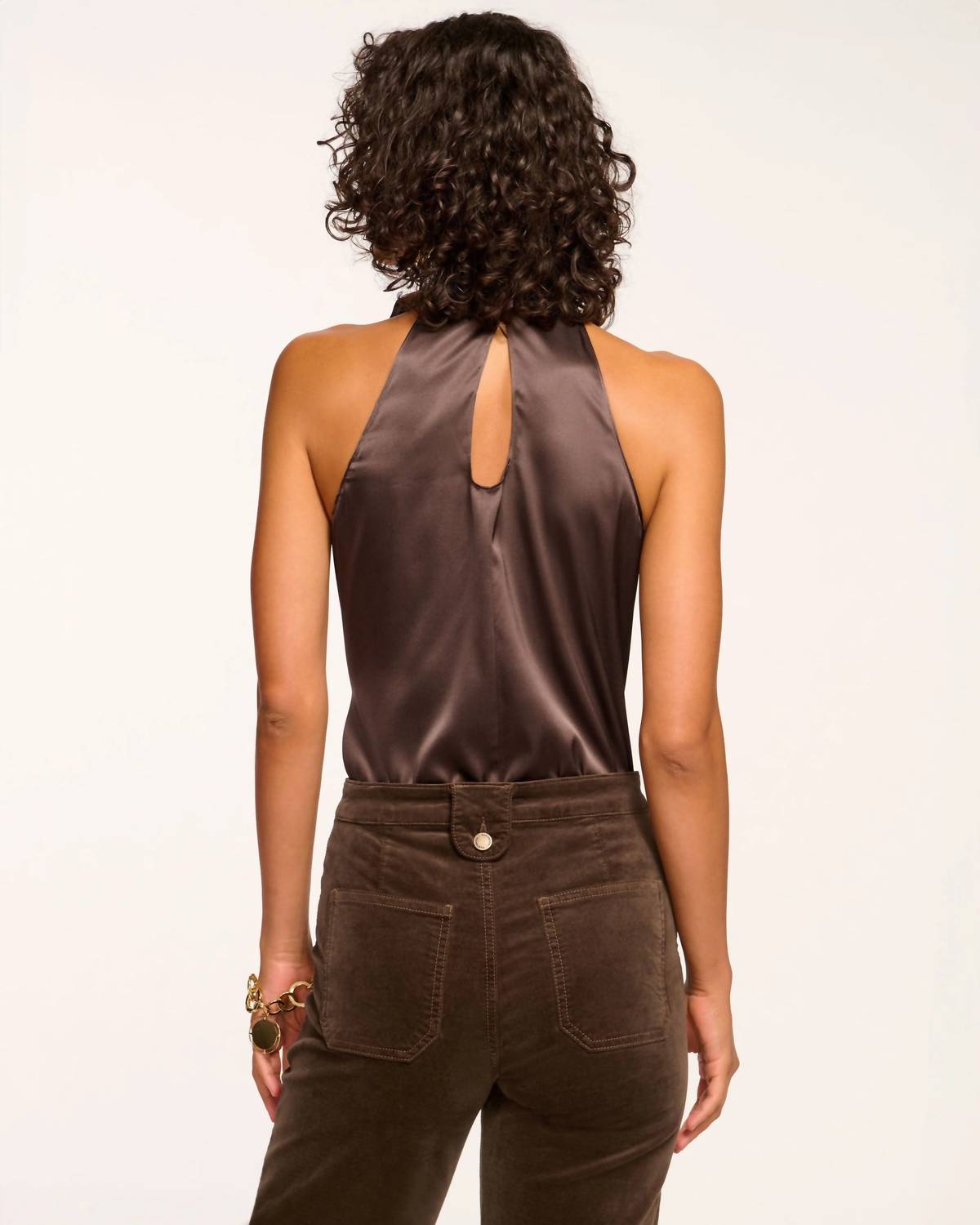 Silky, satin top. Bow adorned high neck, the Lori can be worn front or back, giving you the option to keep your look demure or reveal some skin with the key hole cut out. 95% Silk 5% Spandex. Dry Clean or Hand Wash.