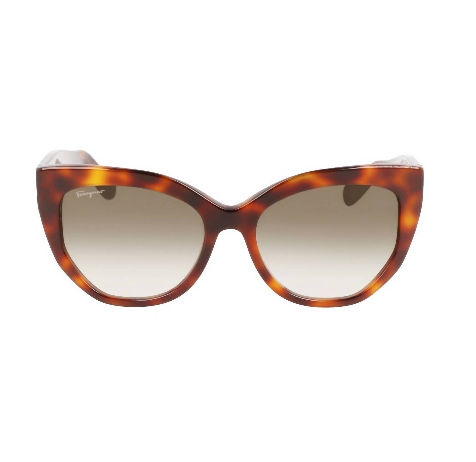 Elevate your eyewear collection with the Women's SF1061S Sunglasses by Salvatore Ferragamo. These full-rim cat-eye sunglasses are crafted from luxurious acetate, offering durability and a stylish tortoise/brown gradient color. Made in Italy, they feature a lens width of 56mm, lens height of 49mm, a bridge size of 18mm, and temple length of 145mm, ensuring a comfortable and fashionable fit. Perfect for any sunny adventure, these sunglasses combine classic design with modern sophistication.