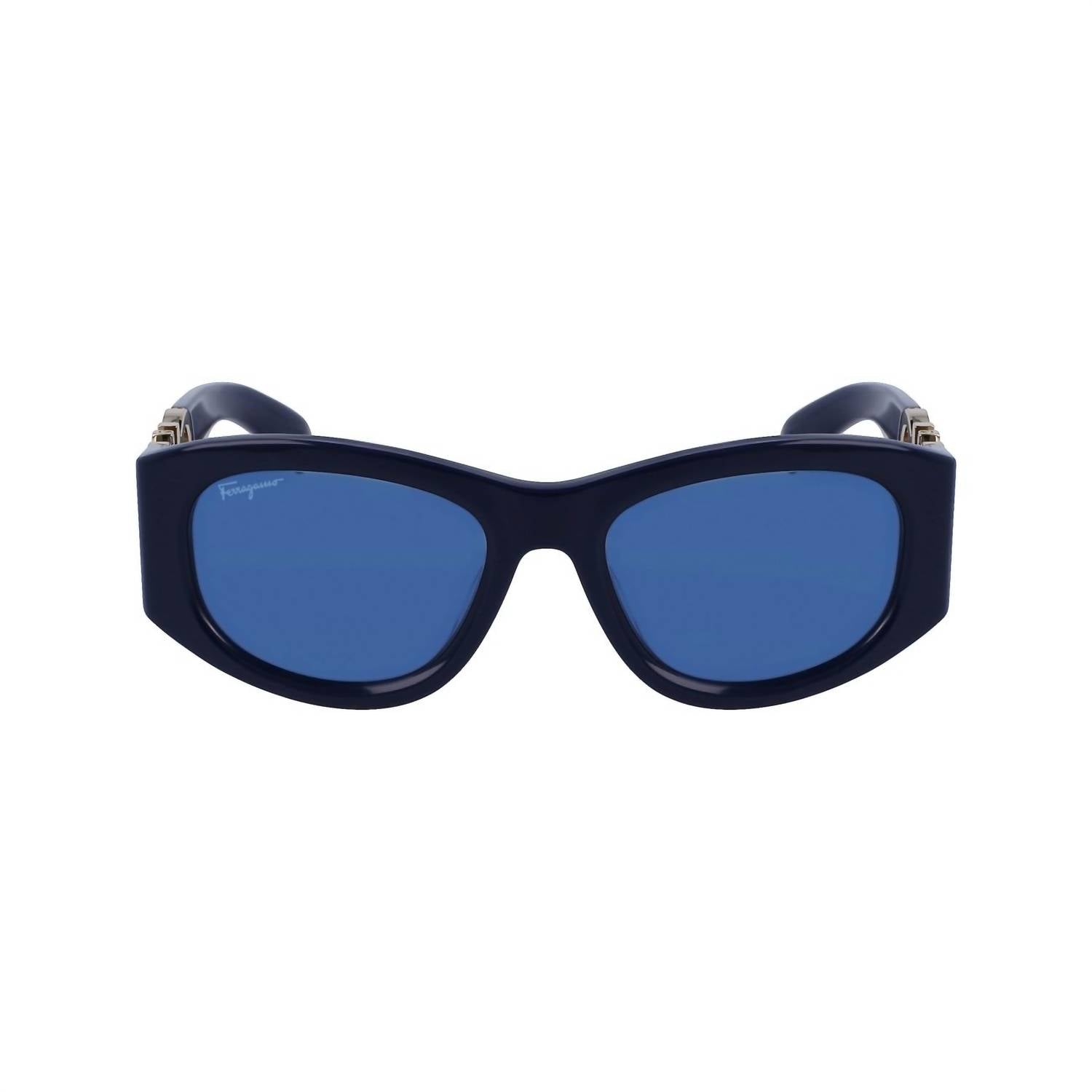 Introducing the Women's SF1082S Sunglasses by Salvatore Ferragamo, a stunning blend of elegance and modern design. Shape: Cat Eye. Material: Acetate. Size Specifications: 53 mm lens, 19 mm bridge, 120 mm temple. Rim Type: Full Rim. Bridge Type: Single Bridge. Color: Blue/Blue. Perfectly embodying the sophistication of the Salvatore Ferragamo brand, these sunglasses add a chic touch to any ensemble.
