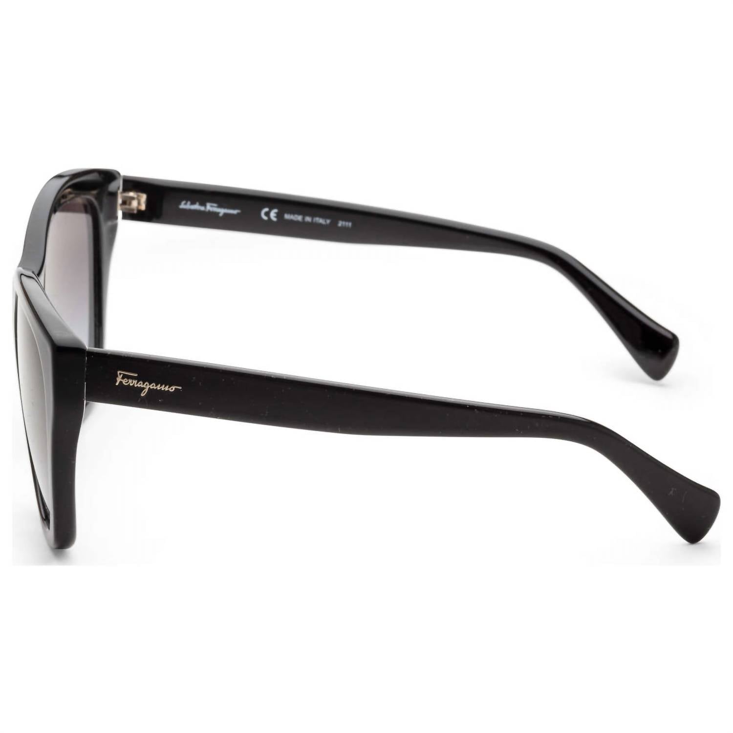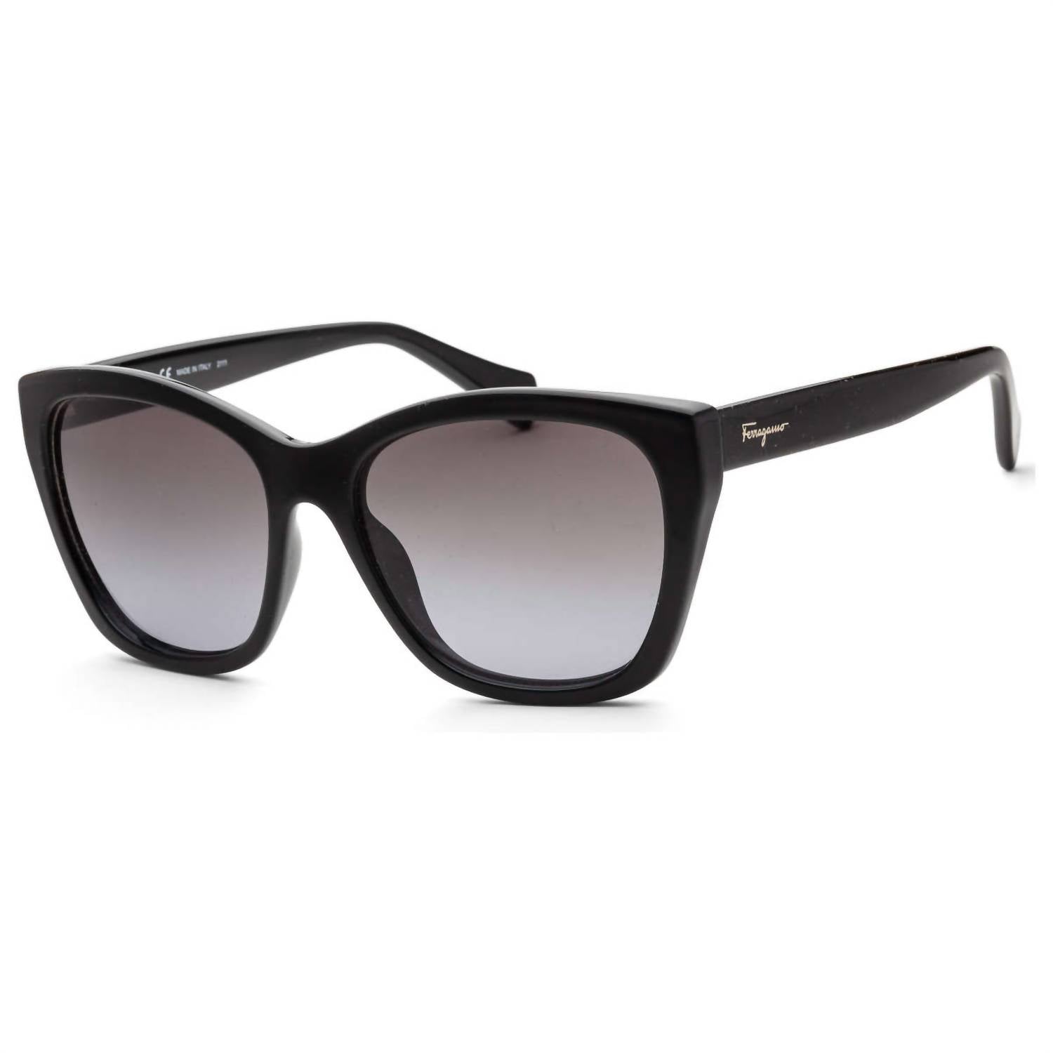 Introducing the Women's SF957S Sunglasses by Salvatore Ferragamo, a blend of Italian elegance and modern design. These cat-eye frames are crafted from durable plastic in a sleek black color, paired with grey gradient lenses. Offering 100% UV protection, the sunglasses feature a non-polarized lens with a width of 56 mm, a comfortable bridge width of 17 mm, and arm length of 135 mm. Proudly made in Italy, these sunglasses not only ensure eye protection but also exude a sophisticated style.