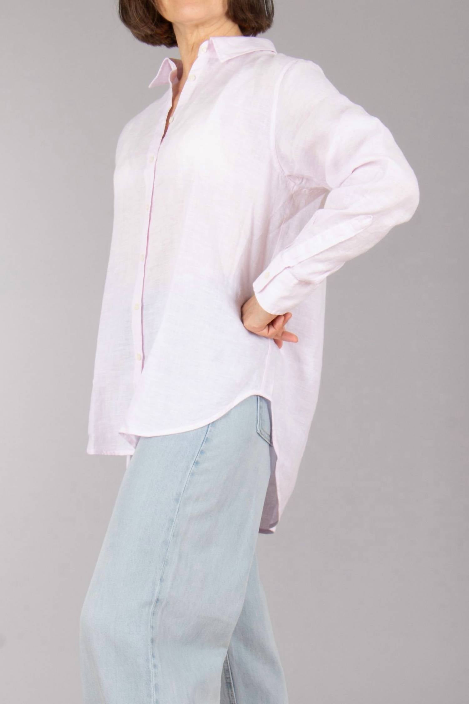 Introducing the Linen Button Down Collared Shirt by 0039 Italy, an elegant piece in a soft pale pink hue. Expertly crafted with 100% linen, this long sleeve blouse features an exclusive concealed button placket with an open hem and one-button cuffs. Its straight cut and loose fit ensure a comfortable wear, while a pleat on the back shoulder yoke and an extended back add a modern twist. Made in Portugal, this shirt is ideal for workwear or a holiday party, and requires hand wash and line dry care.