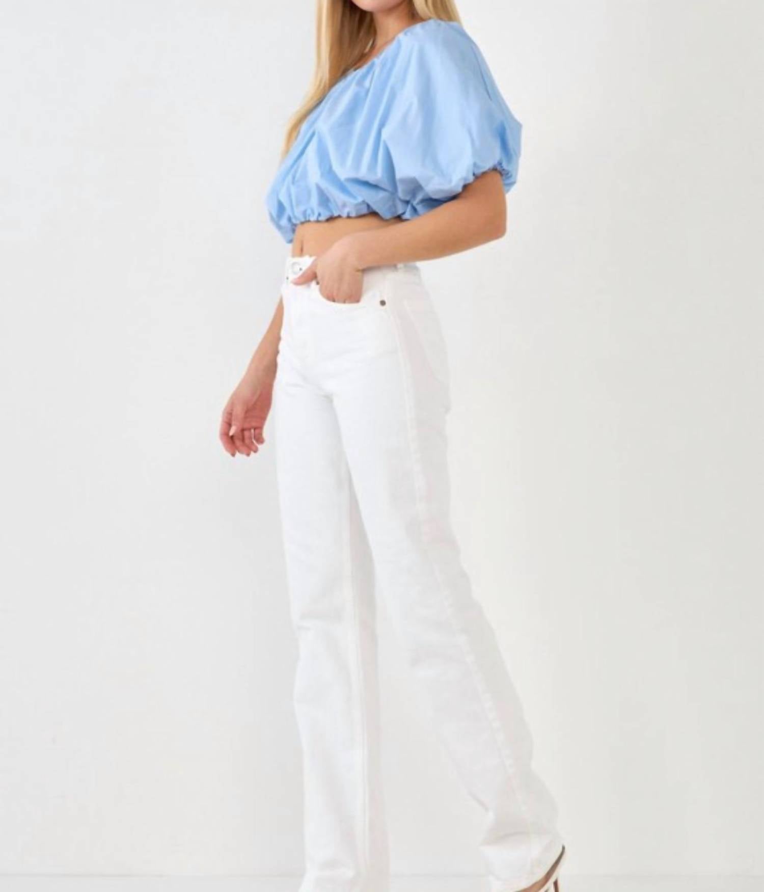 Pair this crop top with your favorite high-waisted jeans or maxi skirt.Effortless style and delightful blend of chic and comfort. Crafted from 100% cotton. I a dreamy powder blue hue. Flirty yet sophisticated look. Puff sleeves add a touch of playfulness. Versatile neckline gives you styling options. Wear it on the shoulders for a flattering V-neckline. Off the shoulders for a charming square neck. Pull-on closure. Offers convenience without compromising on style.