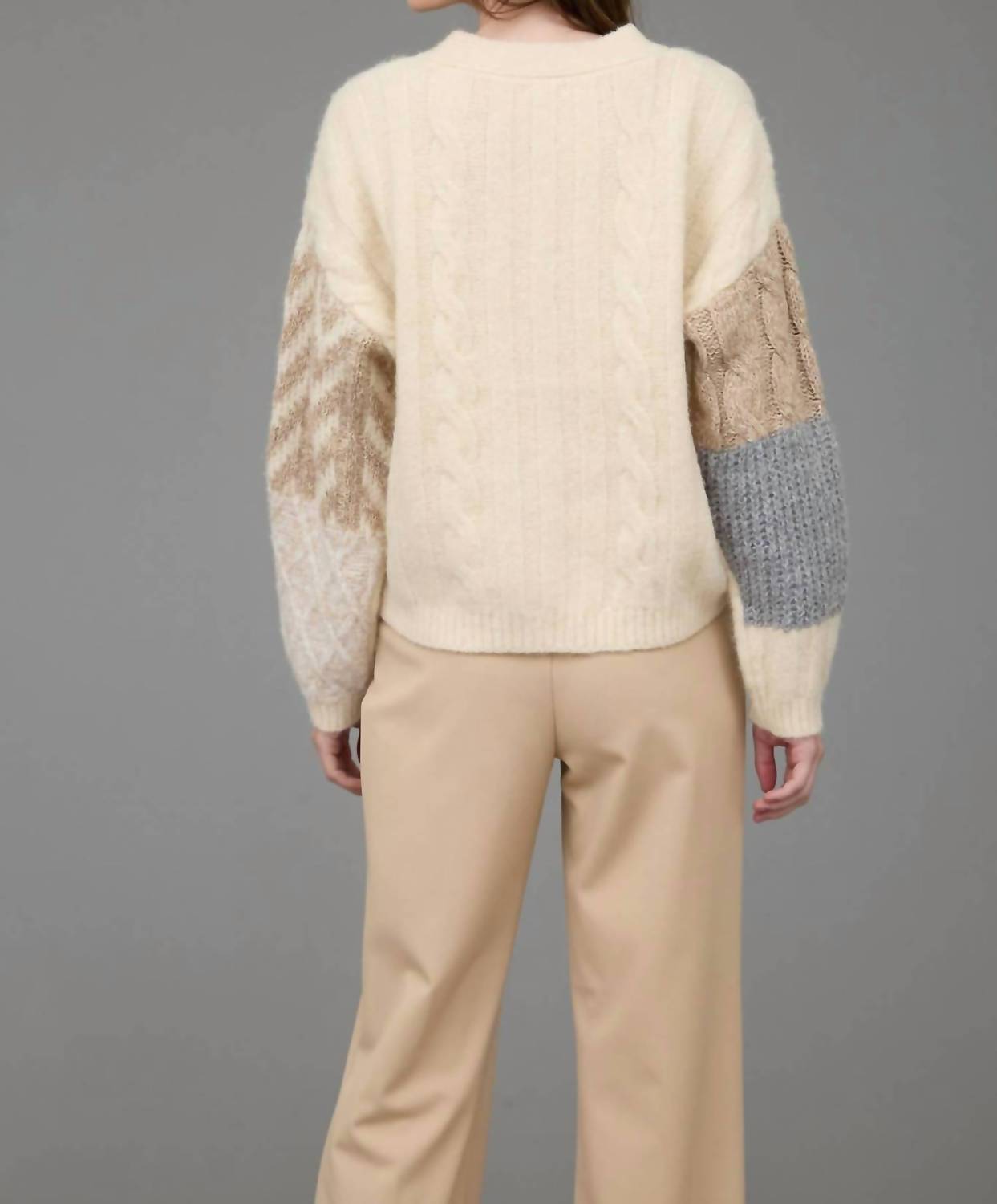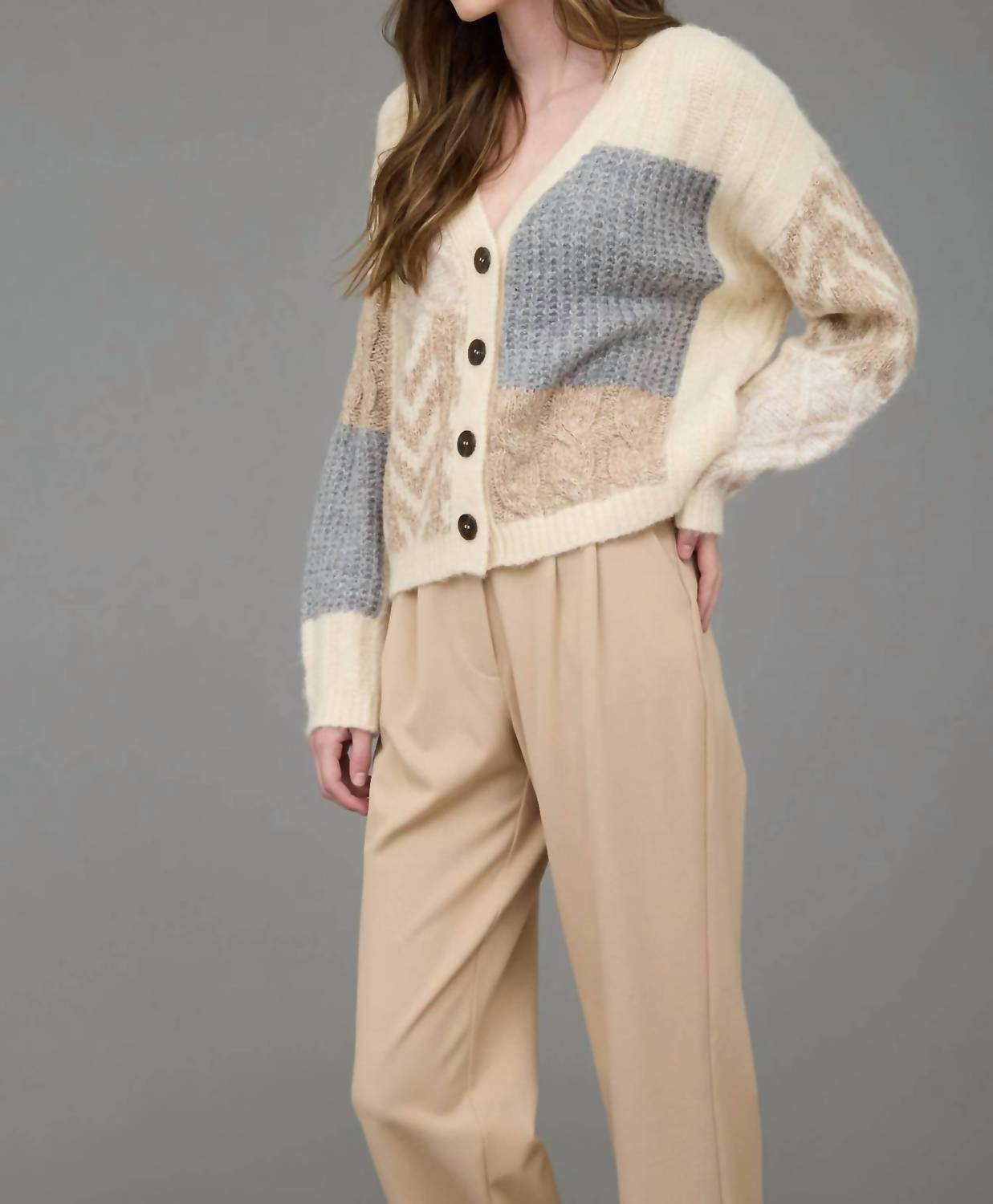 Featuring long sleeves and a comfortable v-neckline, this cardigan showcases a drop shoulder and button closure for an easy, relaxed fit. With a unique blend of polyester, cotton, acrylic, wool, nylon, and spandex, it offers both style and comfort.