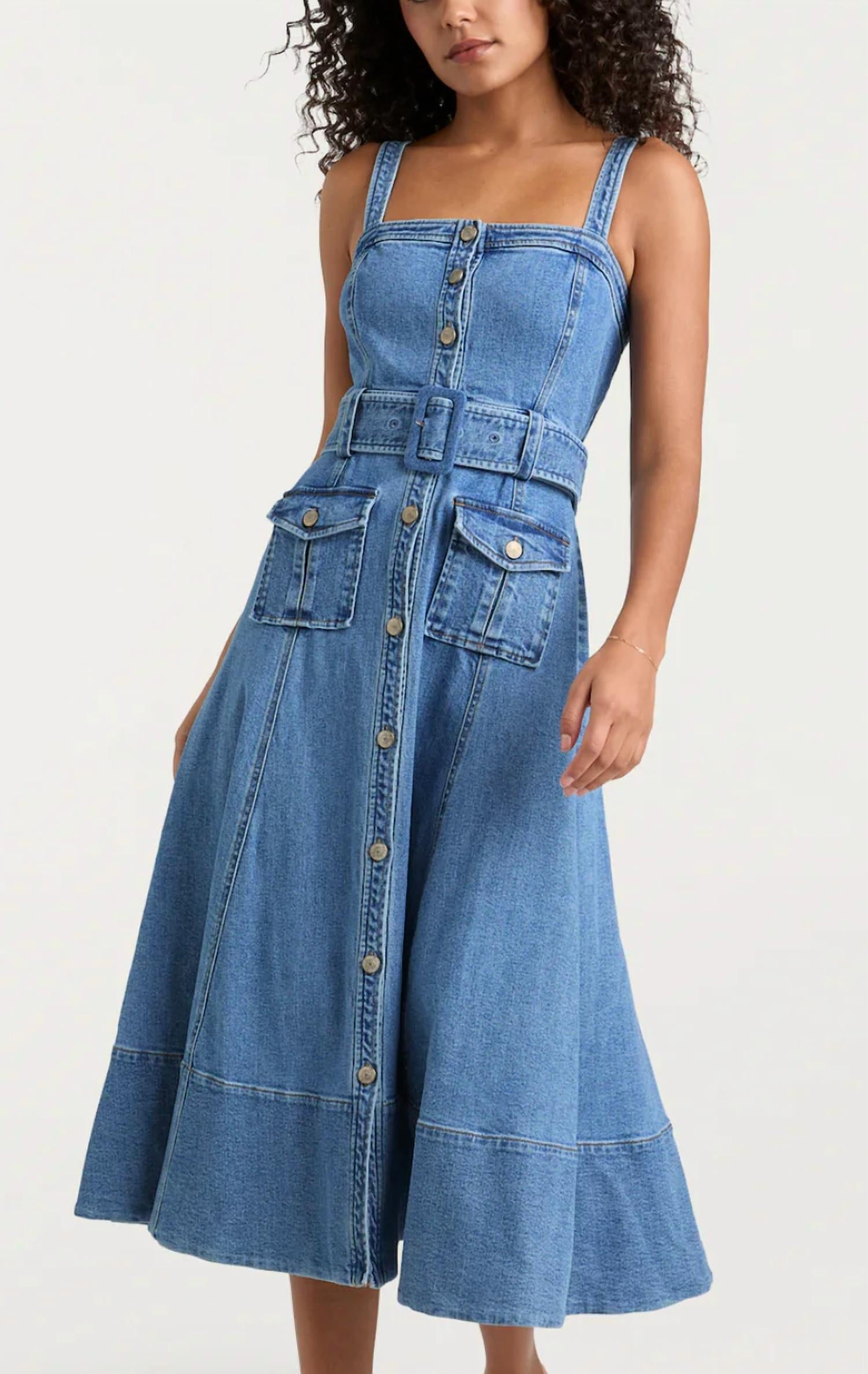 Just add slides or mules and you are good to go. Introducing the Women's Denim Vega Dress by Cinq a Sept, a chic and versatile piece perfect for any summer getaway. This streetwear-inspired A-line dress features a classic squareneck design and is sleeveless, offering a fresh look for warm vacation days. Made from premium denim, it comes in a vibrant blue hue and is designed for easy wear with a pull-on closure. Ideal for those seeking a stylish yet simple outfit choice.