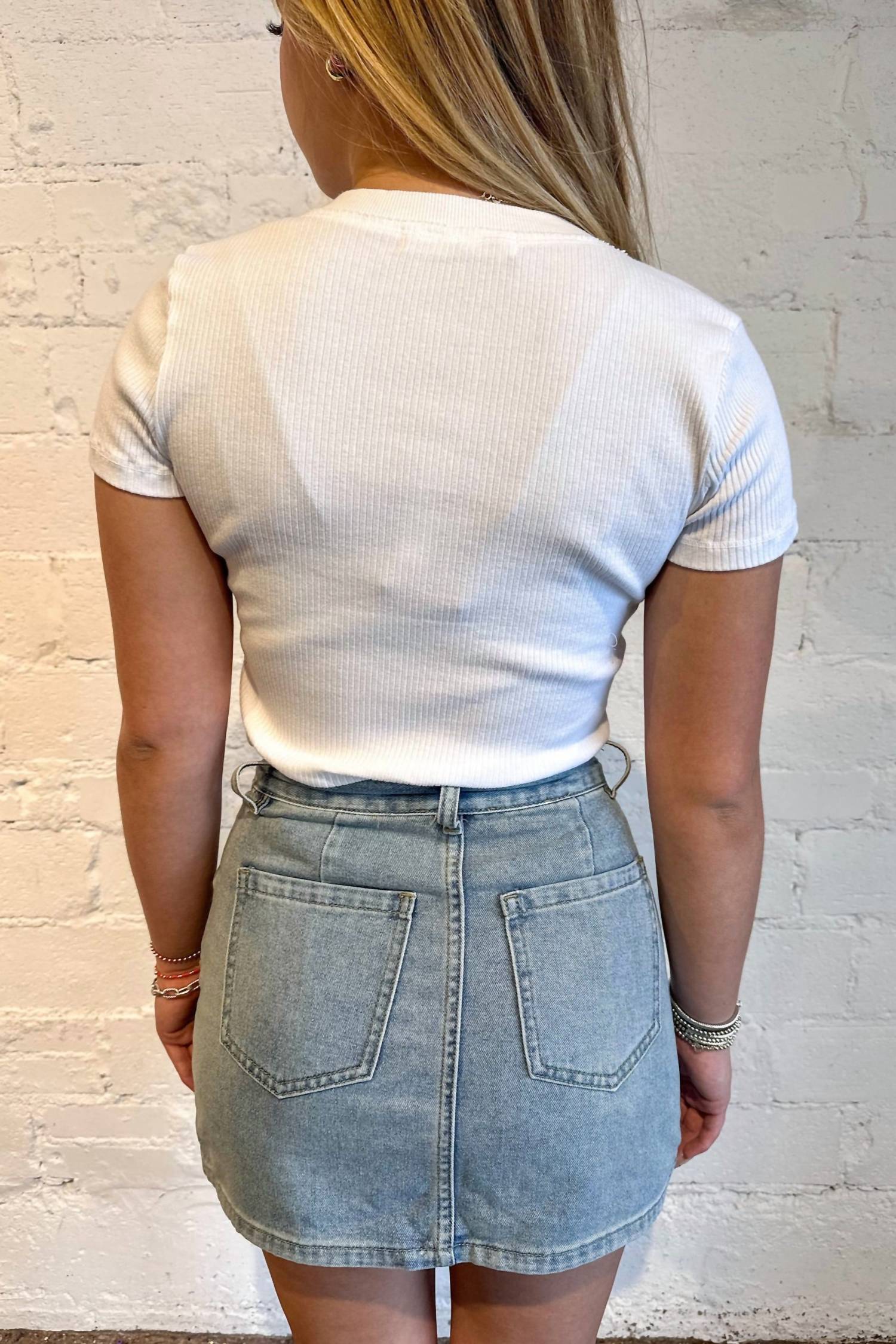 The perfect mini skirt does exist. Introducing the High-rise Pearls & Denim Mini Skirt from Cloud Ten, a chic blend of casual and elevated style. Made from 100% cotton, this skirt features a modern mini length with a flattering high-rise fit. The button closure adds a practical touch, while the unexpected elegance of pearl embellishments offers a unique twist.