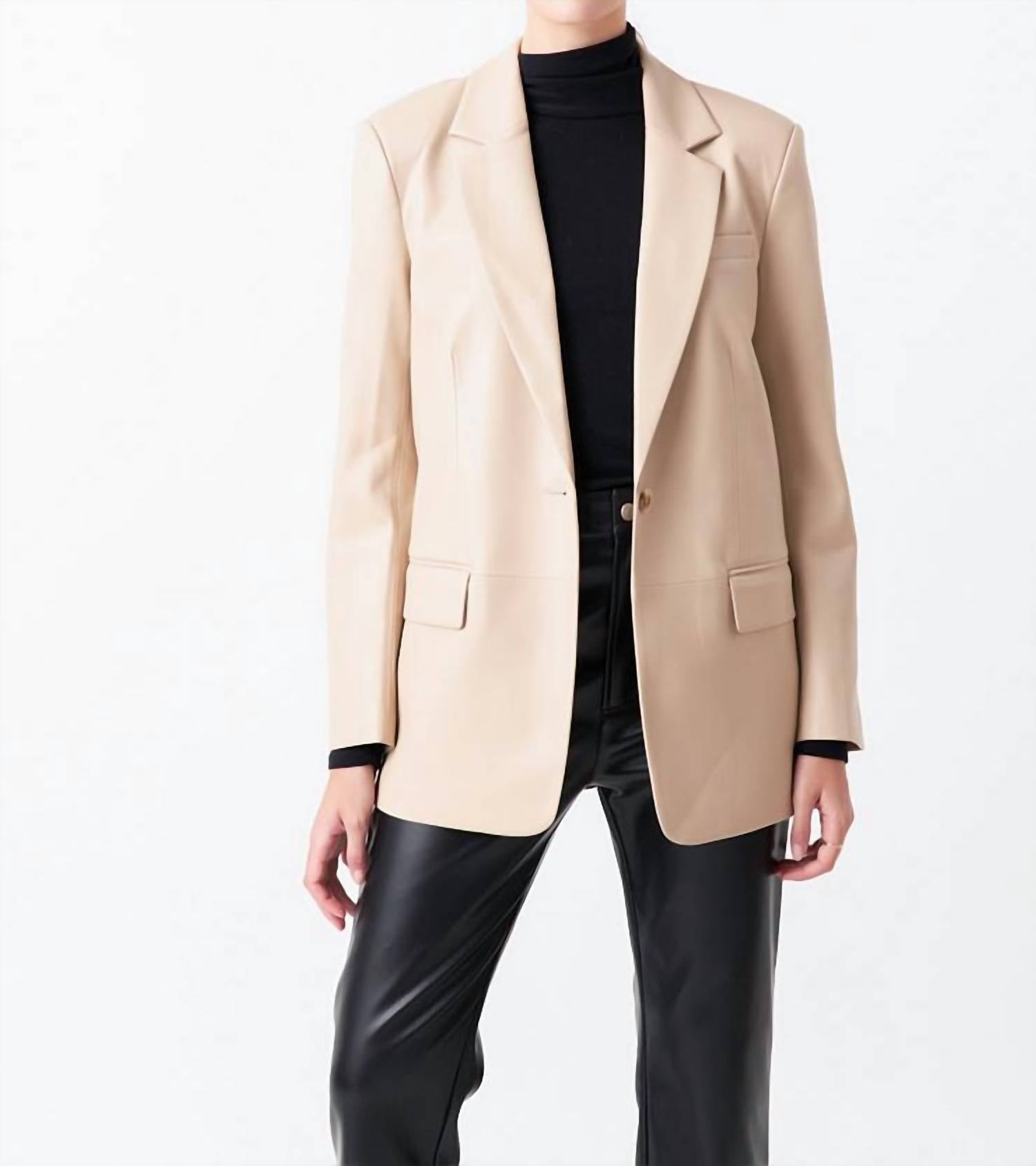 Tailored to perfection, this blazer will be your go-to jacket for years to come. Introducing the Beige Faux Leather Notch Lapel Blazer by Endless Rose, a chic addition to your wardrobe with its long sleeves crafted from polyester. Featuring a refined 30" length for size small, this solid blazer comes with functional jetted pockets and a chest pocket. Its notch lapel and single button closure highlight its minimalist yet sophisticated style, complemented by front darts for a tailored fit. To keep this versatile piece in pristine condition, hand wash and lay flat to dry. Bust measurement: 38" on size small.