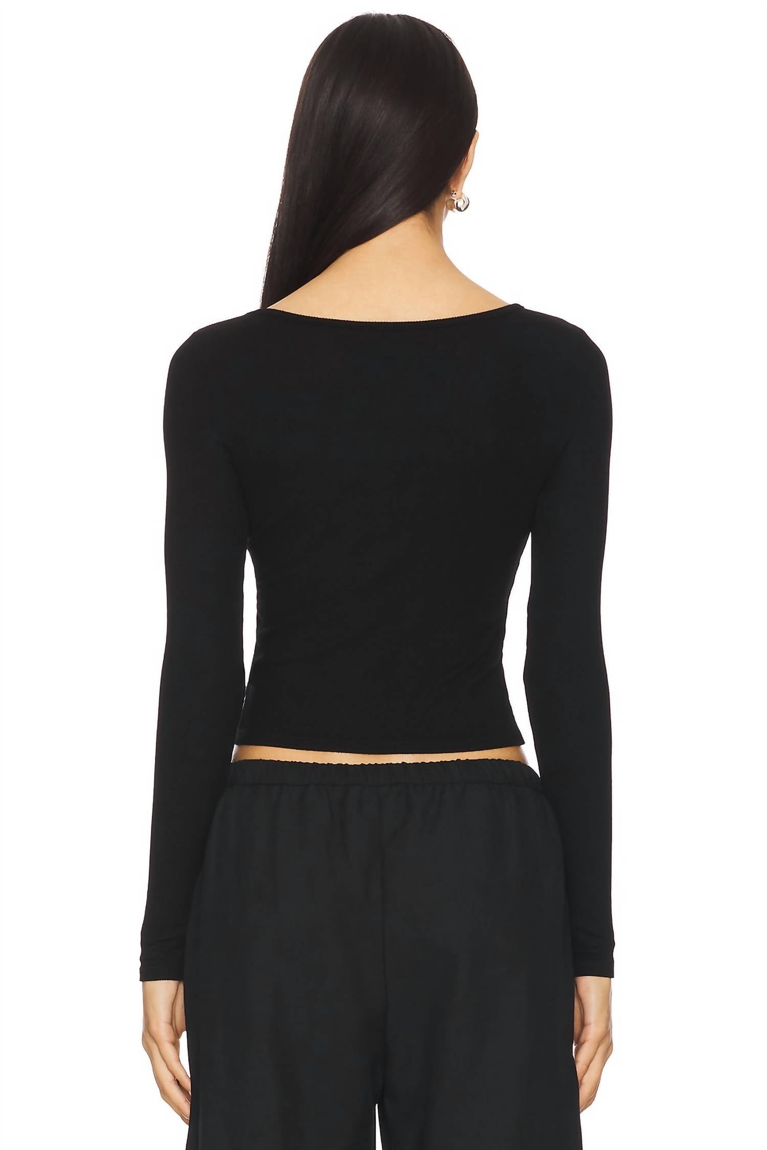 Show a little skin in this cute and casual crop top. Elevate your wardrobe with the Silk Knit Ballet Top by Enza Costa, a luxurious addition for any fashion enthusiast. This women’s top in solid black features long sleeves and a scoop neckline, combined with soft stretch for a flattering, body-skimming fit. Made from a viscose blend with 10% silk for durability, this elegant piece is crafted in the USA. The pull-on closure ensures easy wear, and it is conveniently machine washable for your convenience. 10% Silk 87% Viscose 3% Lycra.