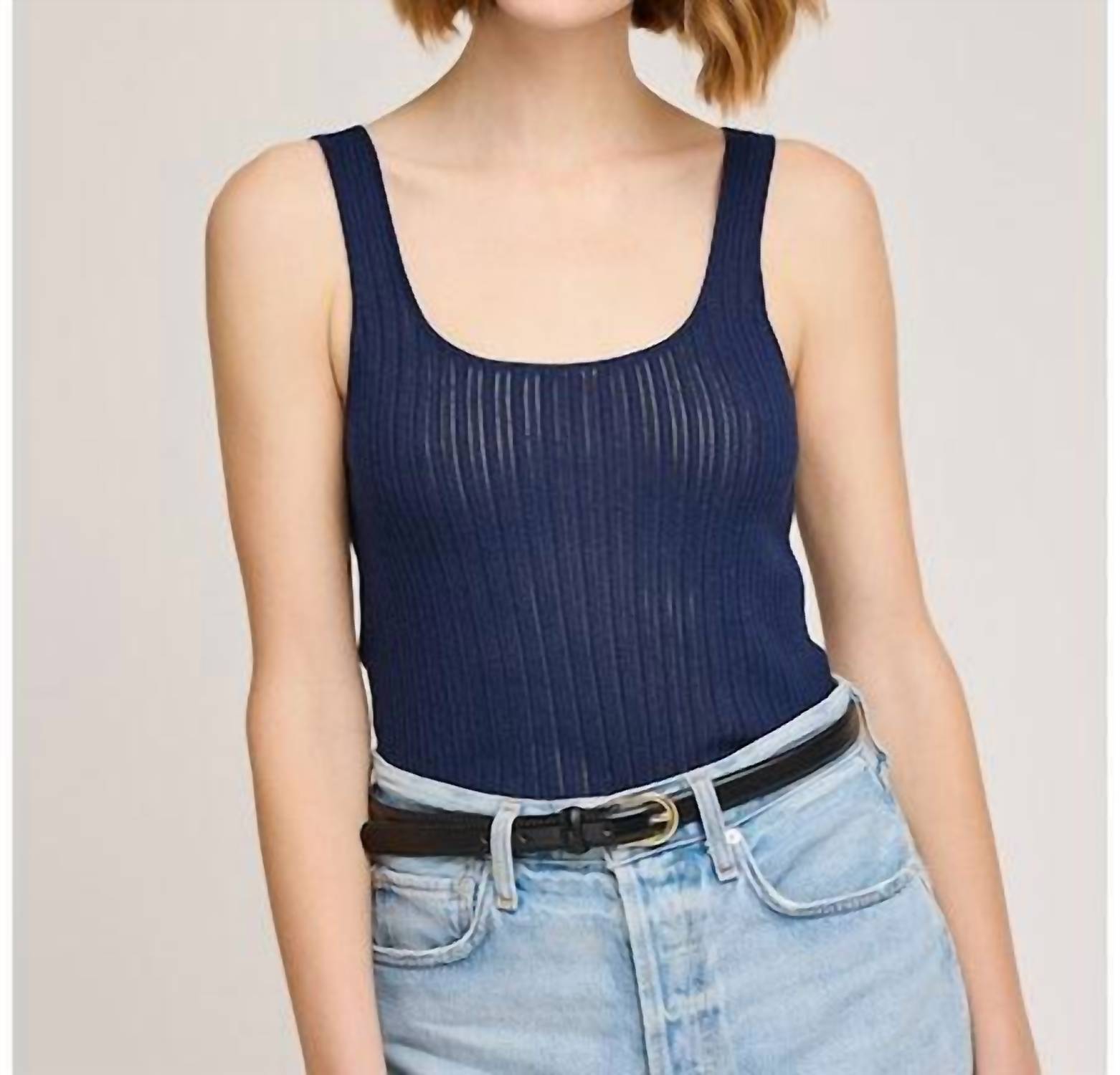 Fit, fabric and functionality. This tank top checks all the boxes. Introducing the Gentle Fawn Gaia Tank, a minimalist sleeveless top perfect for your summer wardrobe. Crafted from lightweight viscose, this navy knit tank features a flattering scoop neckline and a delicate scallop hem. With a solid pointelle knit pattern, it measures 22.25 inches in length for a comfortable, slim fit. Care: Hand wash and lay flat to dry to maintain its elegant shape and style.